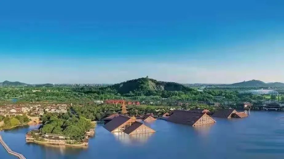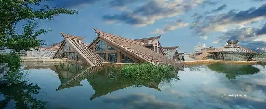 初见广富林,一定会被“漂浮”于富林湖上的建筑群所震撼,三座硕大的斜坡屋顶浮于水面,主体则没于水下,寓意着广富林文化随着退去的湖水,逐步展现在世人面前。