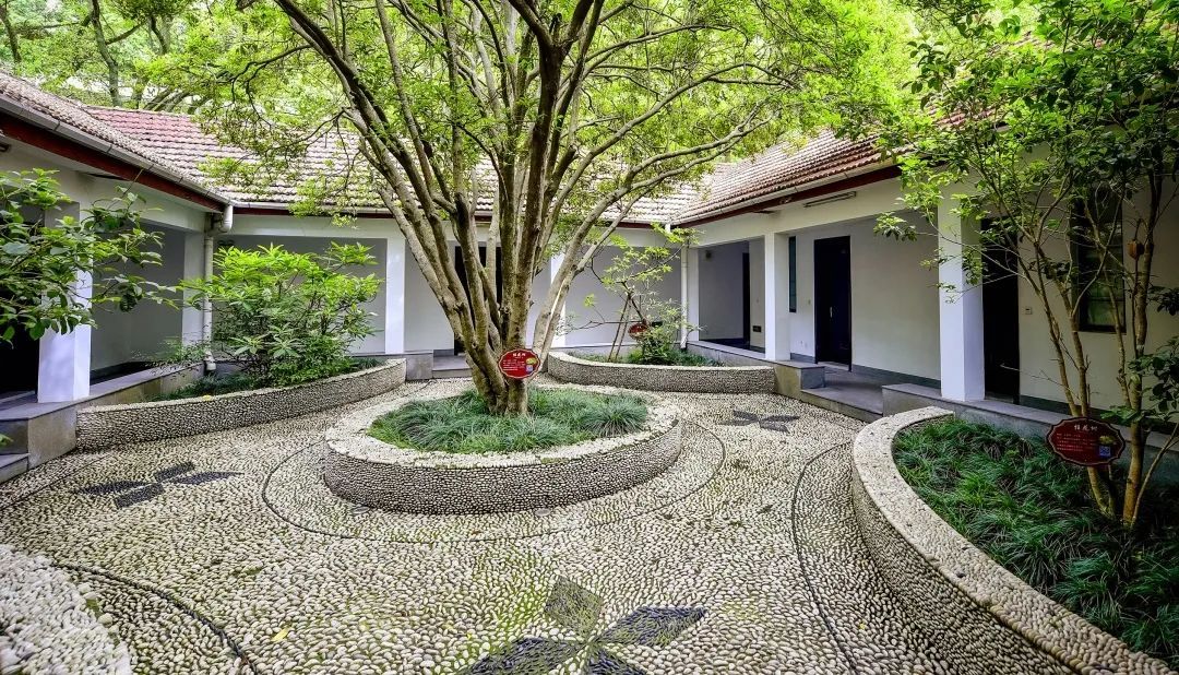 宽敞的外院中,一条清水泥车道沿绿意盎然的环岛而建,两边是大片的草坪,高大树木错落其中。穿过“小白楼”底层,有一处方正内院,三面白色回廊,地面以黑灰色鹅卵石铺路,设环带形和菱形图案。正中央栽桂花树,四角扇形花坛缀有结香等。