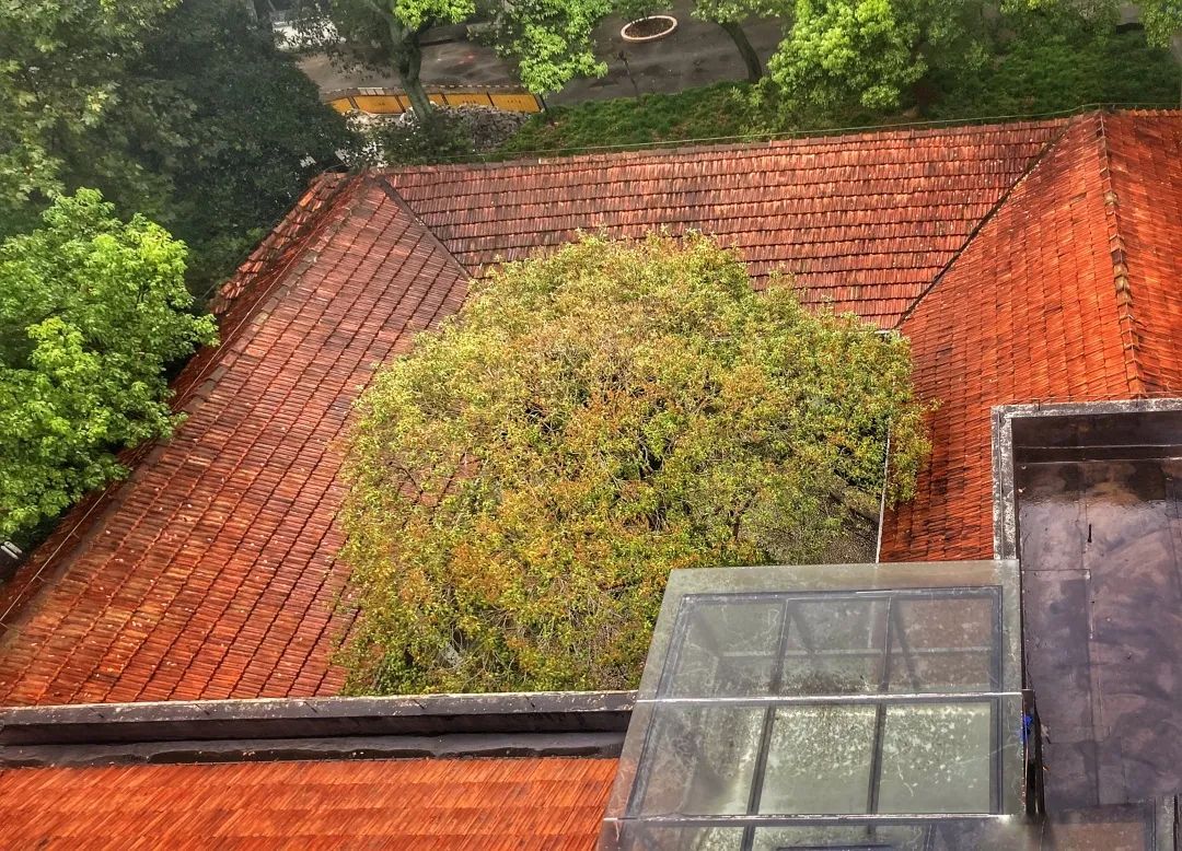 站在塔楼俯视,浓郁的绿色映衬着主楼二层部分以上的阁楼层以及主楼一层部分的双坡红瓦屋顶。