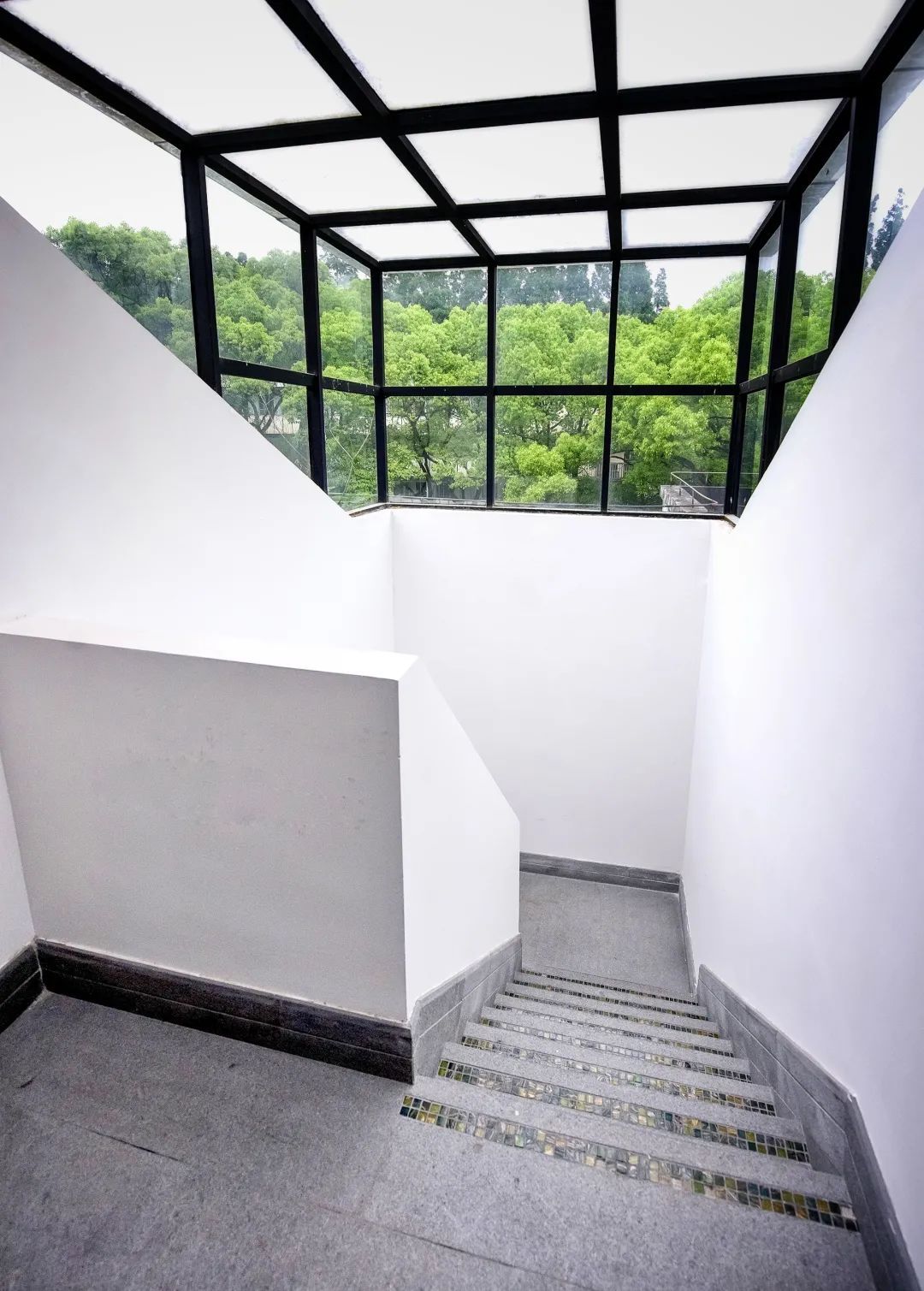 在主楼二楼至三楼的拐弯处设计改建了由大块玻璃和铝合金支架四面搭建而成的采光天窗,透光透绿。此阳光房与灰色台阶、雪白墙壁和谐呼应,成为整栋建筑朴素宁静之美的有机组成部分。