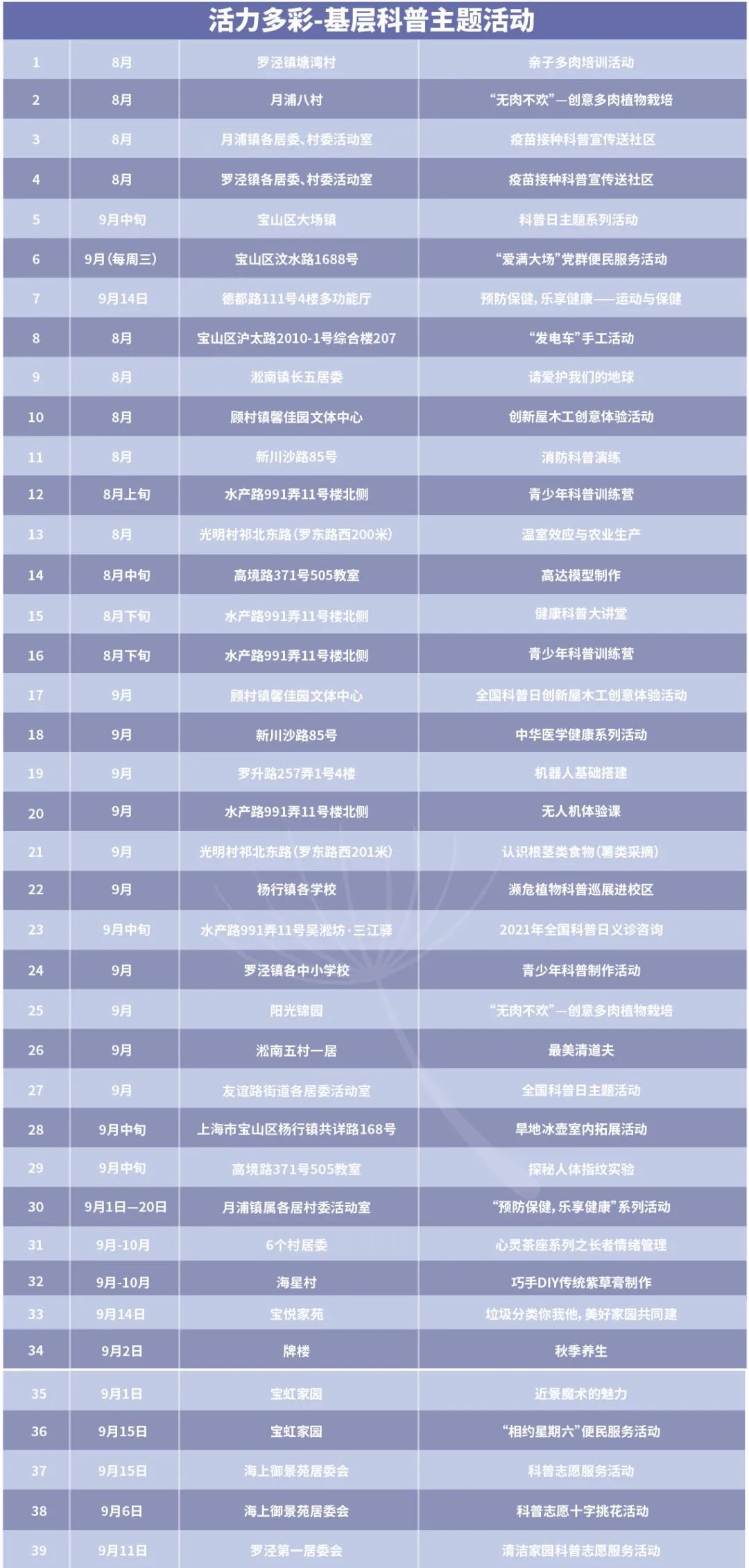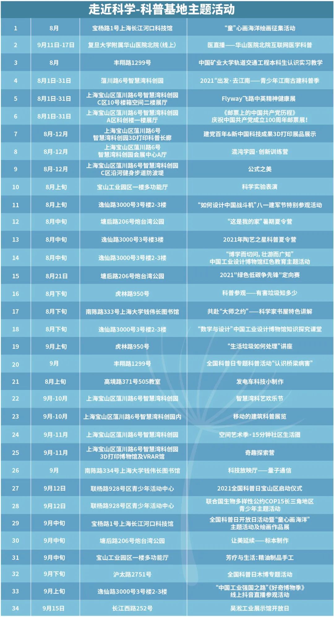 在2021宝山区科普日专题活动--宝山区公众科普开放日活动中,您可以近距离了解和体验在我们身边的科学阵地。科普日期间,这些场馆有哪些精彩活动等待大家?让我们先睹为快!