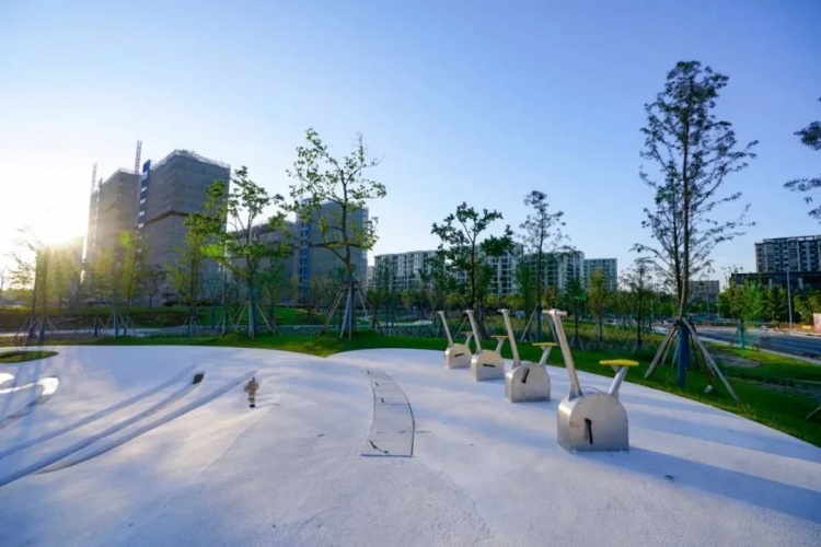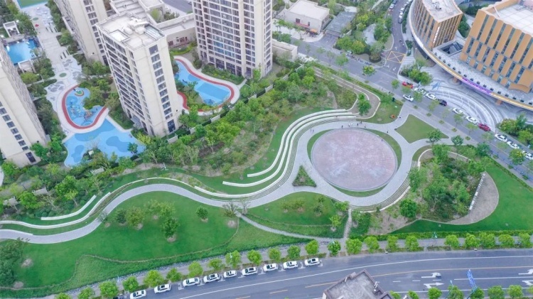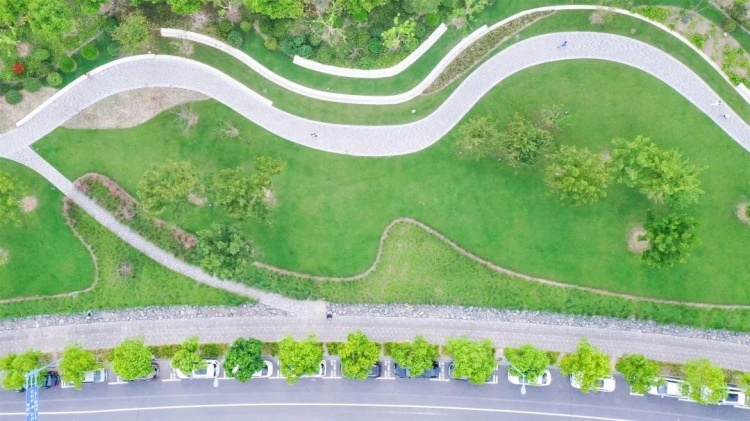 除了新建设施,蓝湾公园二期在建造时局部抬高了地形,利用自然的地景艺术,合理配置观花植物,营造出变化多端的中央公园,建设成游憩、生态、景观相互融合的绿地。西侧与社区围墙之间种植绿林背景,作为公共与私属的隔离;东侧与道路相邻,则更加开放,将整个道路纳入公园体系,打造富有诗意的社区乐活空间。