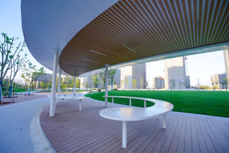 全新建成的二期延续了一期“蓝湾踏浪”的设计概念,提取“浪花”“浅滩”“拾贝”的设计元素,整体上采用流线型的线条作为基底。临港奉贤经济发展有限公司工程项目经理胥明介绍:“考虑到二期项目体量较大,我们在规划设计时引入更多活动功能,来提升居民的体验度、感受度。公园中心区设置了长廊、书吧等,为居民提供休闲停留空间,还新建了游玩设施、互动水景等,点缀其间。多种功能复合串联,以蜿蜒的景观步道贯通,让大人、小孩都能尽情体验。”