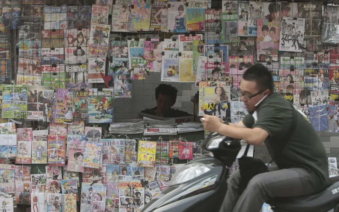 (2009年6月1日,南京街头挂满报刊杂志的书报亭。)