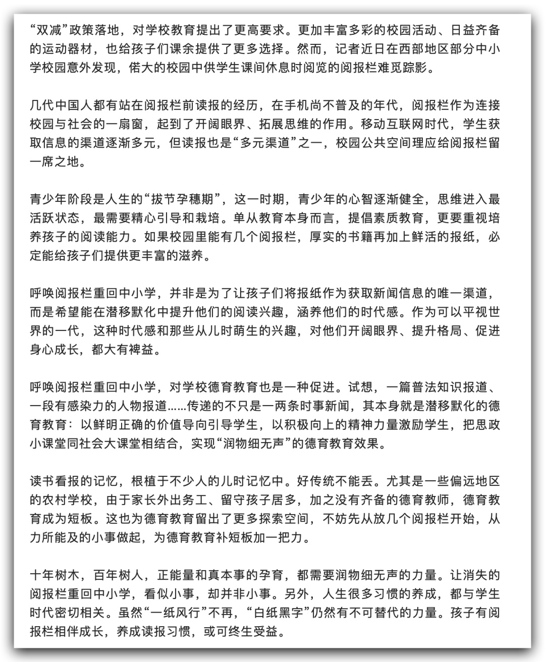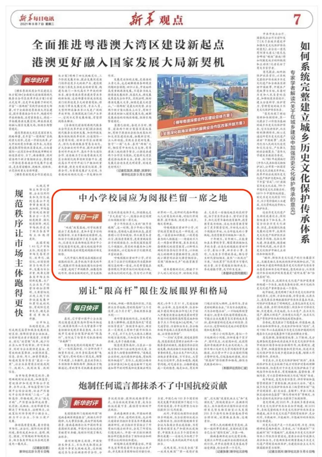 今日《新华每日电讯》中一篇名为《中小学校园应为阅报栏留一席之地》的评论文章,文章中指出:“试想,一篇普法知识报道、一段有感染力的人物报道……传递的不只是一两条时事新闻,其本身就是潜移默化的德育教育:以鲜明正确的价值导向引导学生,以积极向上的精神力量激励学生,把思政小课堂同社会大课堂相结合,实现“润物细无声”的德育教育效果。”