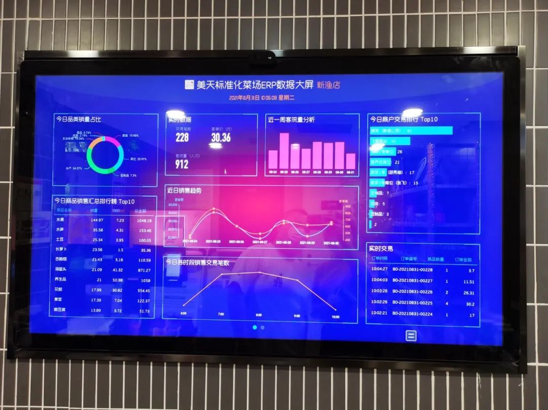 今天什么菜卖得好?哪个摊位更便宜?在菜场正门入口处的美天标准化菜场ERP数据大屏上,品类销售占比、商品销售汇总排行、商户交易排行、客流量分析等数据清晰明了地呈现,方便顾客了解行情。