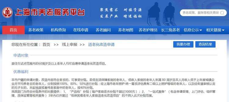“实施老年人居家适老化改造,应坚持需求导向,政府重点支持保障特殊困难老年人最迫切的居家适老化改造需求;同时,顺应广大老年人居家养老的意愿与趋势,以满足其居家生活照料、起居行走、康复护理等需求为核心,改善居家生活照护条件,增强居家生活设施设备安全性、便利性和舒适性,提升居家养老服务品质。”去年,民政部、国家发展改革委等九部委联合印发《关于加快实施老年人居家适老化改造工程的指导意见》指出居家适老化改造的目标任务。今年七月起,上海市居住环境适老化改造全面推开。