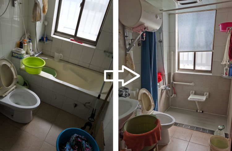 “浴改淋”改造后,曾经的麻烦没有了,老人洗澡变成了“享受”。浴缸一拆,空间也立马腾了出来,靠墙安装了可折叠沐浴凳,淋浴区地面、墙面做了干法工艺铺贴,安装了L型安全扶手,崭新的置物架、毛巾架让卫生间大变样。赵阿姨说:“高龄老人洗澡不宜久站,有了沐浴凳的辅助,淋浴变得更加舒适。”