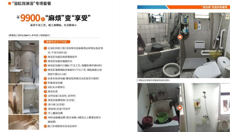 而另一个“浴缸改淋雨”专项套餐,主要是针对试点中反映出来的普遍存在的老年人浴缸洗浴不便且不安全的问题,提供“浴改淋”标准化改造服务,套餐价格9900元。包括浴缸拆除、防滑处理、淋浴及助浴设备安装等服务,主要解决改善环境设施的关键局部问题。