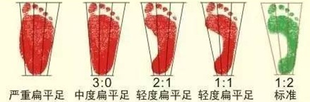 足印法也可以用于检查平足。足底浸湿或蘸印泥后踩在白纸上留下的足印,测量足底内侧空白部分与足印的比例,可以判断平足的严重程度(如图5)。