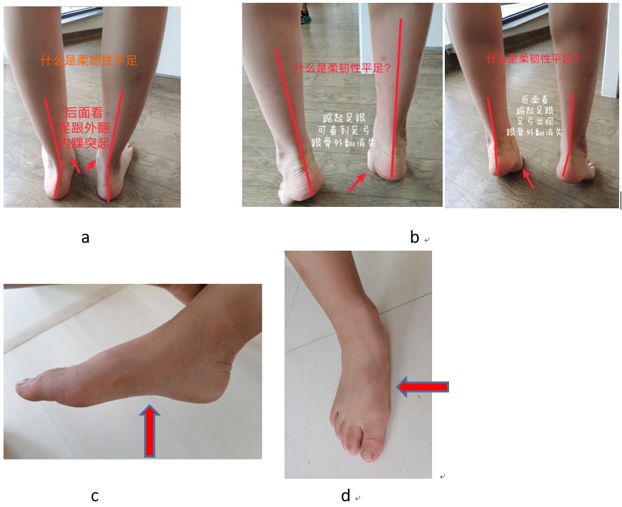 图4:a示孩子站立位从后面视诊,足内侧纵弓消失,足跟外翻,内踝突出,“多址症”;b示 孩子踮足后足弓出现,足跟内翻,内踝突出消失,为柔软性平足;c示 非负重状态有足弓;d示负重位足弓消失