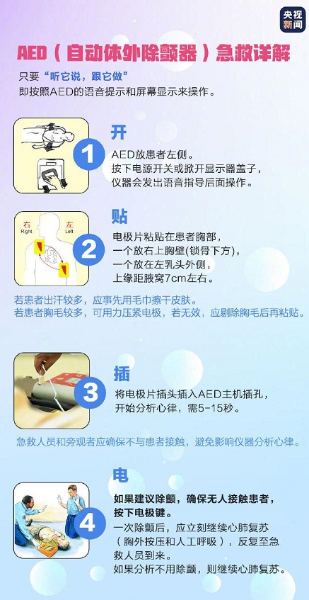 如果在公共场所发生心脏骤停危及生命事件时,在救命的“黄金四分钟”内,正确使用AED(自动体外除颤仪)和实施心肺复苏,能极大地提高院前急救效果,达到挽救生命、减轻伤害的目的。