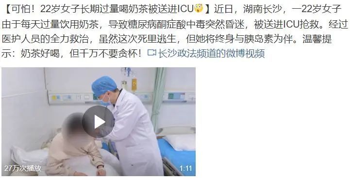 但是,“奶茶续命”很可能会带来健康隐患。长期过量饮用奶茶会诱发糖尿病酮症酸中毒,这是糖尿病的一种急性并发症,可能存在感染、肾功能衰竭、急性肝损害等,危及生命。图中的病例就是发现患者血液因血脂高变成了乳白色,这在年轻人当中实属罕见。虽经过几天的治疗后得以出院,但是将来的生活要与胰岛素相伴。