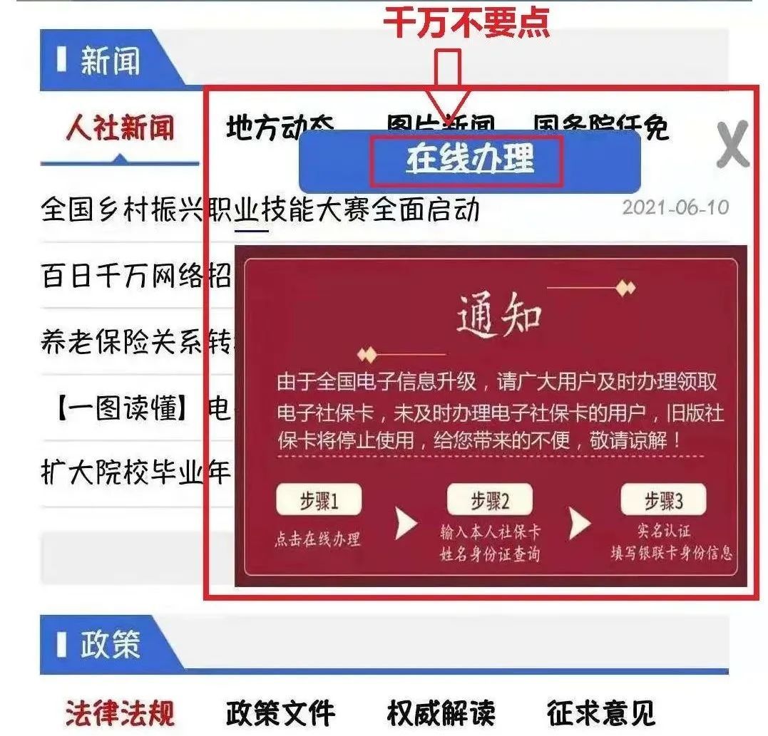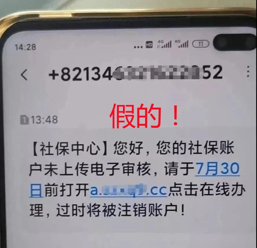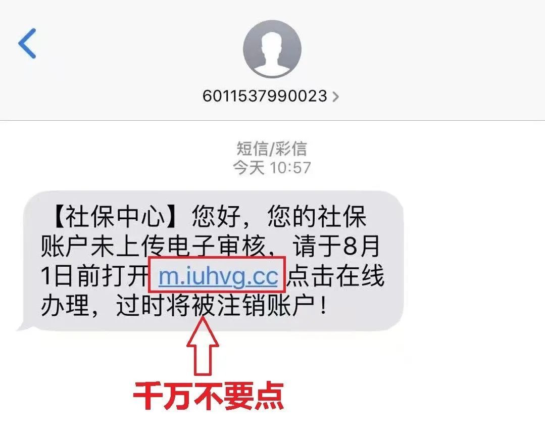 同时,也有不法分子冒用社保部门名义,发短信给群众,称社保账户未上传电子审核,需要群众点击链接在线办理,请大家一定不要上当!!