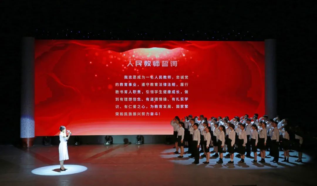 “我志愿成为一名人民教师,做到有理想信念、有道德情操、有扎实学识、有仁爱之心......”在张甦的带领下,40名新教师代表庄严地举起右手,许下了“为教育发展、国家繁荣和民族振兴努力奋斗”的铮铮誓言。