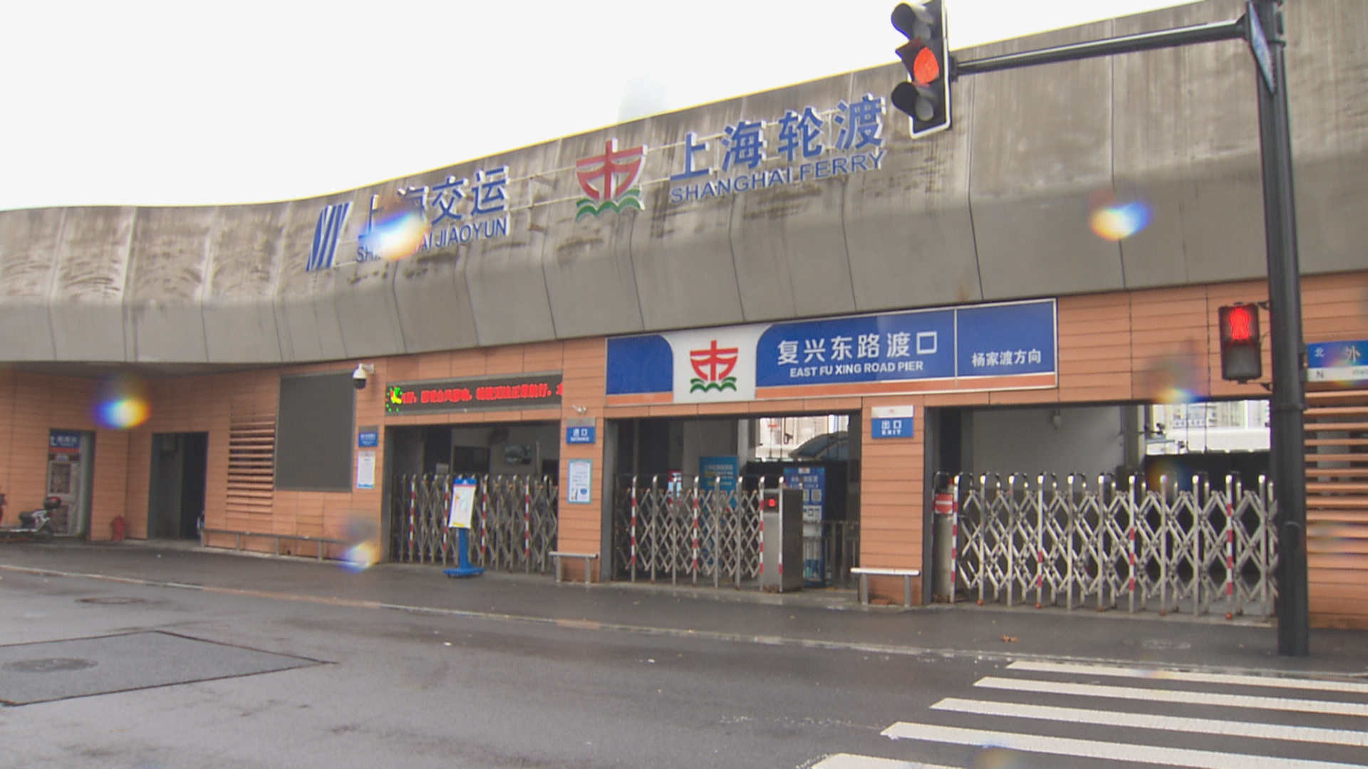在复兴东路轮渡口,现场广播循环播放轮渡停航的信息,而工作人员则在现场,告知需要过江的市民前往复兴东路隧道。