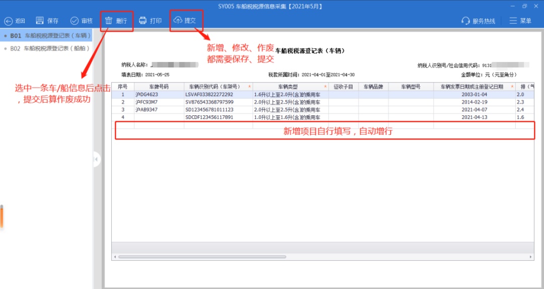 还可以在车船税税源采集界面对车辆信息进行修改/新增/删除车船税税源信息操作。