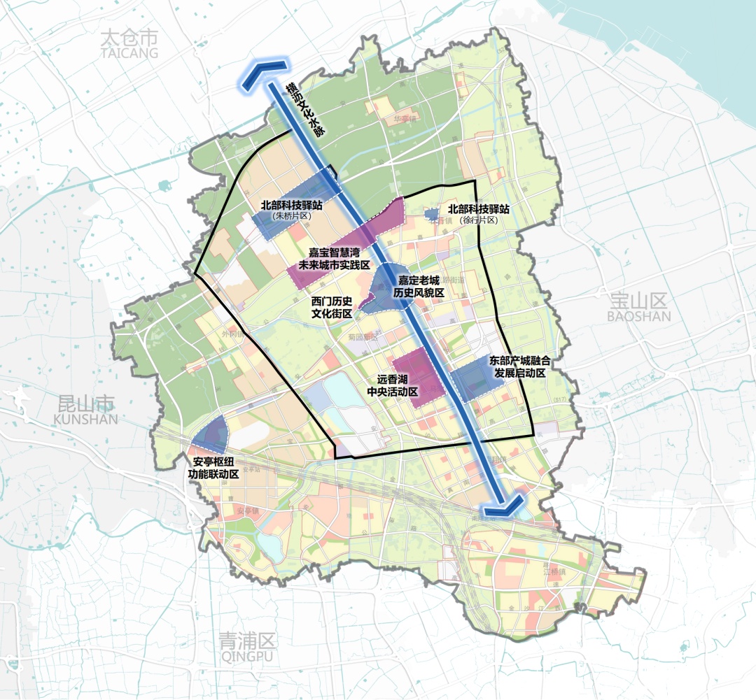功能布局和空间格局上,立足打通长三角一体化和虹桥国际开放枢纽的链接通道,进一步优化嘉定新城空间结构和功能布局,实施“北拓西联”扩区计划: