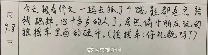 今天跟着师父一起去抓了个贼,鞋都差点给我跑掉,四十多岁的人了,居然偷小朋友摇摇车里面的硬币。(摇摇车:你礼貌吗?)