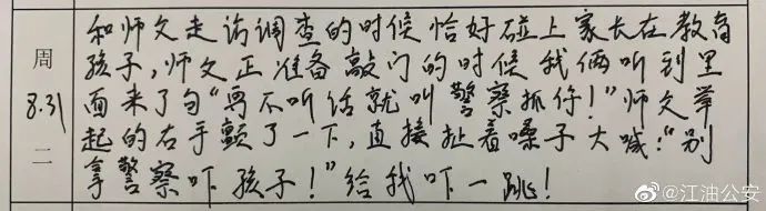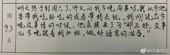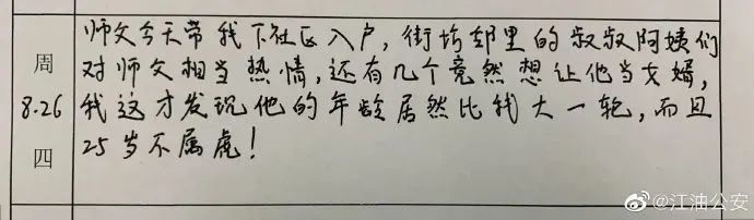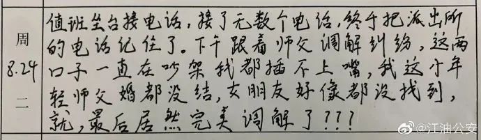 据四川@江油公安介绍,这是“一个警校实习生的实习日记,师徒故事”,来自四川警察学院的学生专业实习教学考核手册。