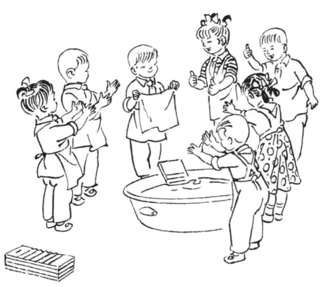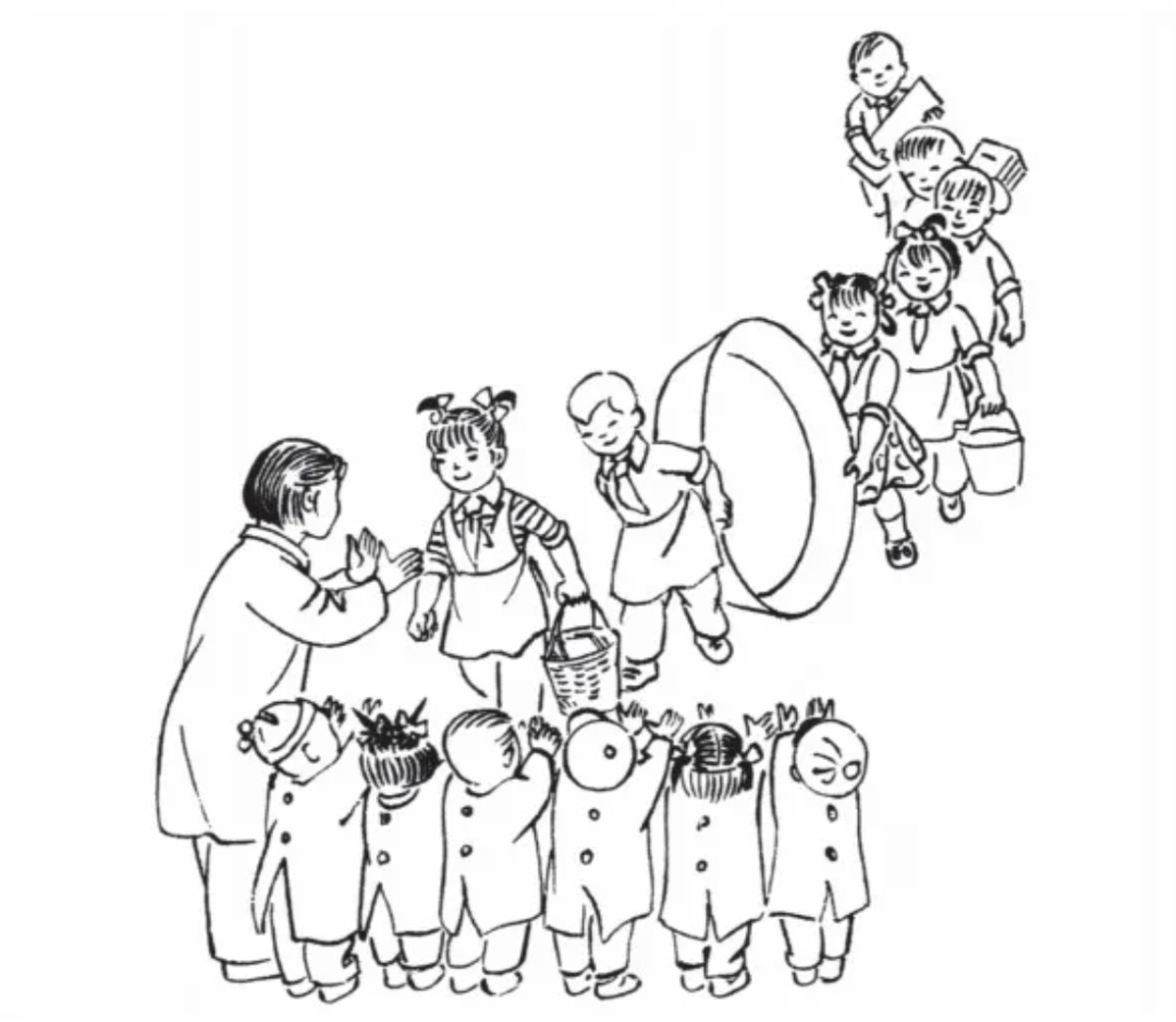 不同于一般的孩子独自在家洗手帕的故事情节,张乐平先生把洗手帕的活动置于集体活动的环境中,让孩子体验到新鲜的、多样化的集体生活经历。
