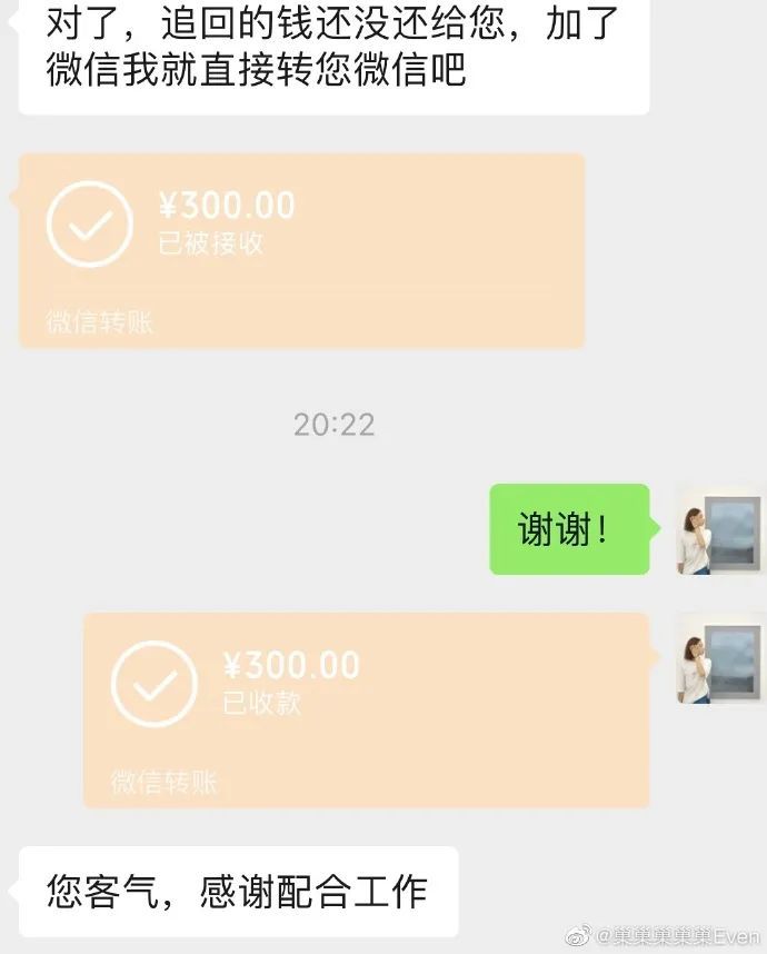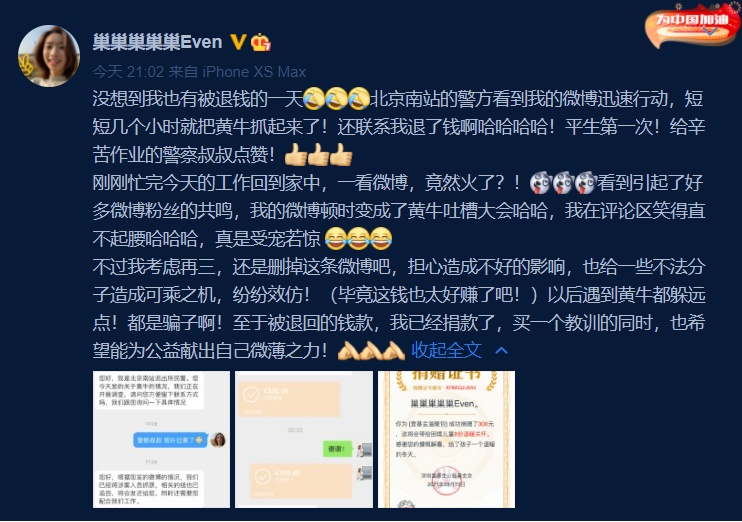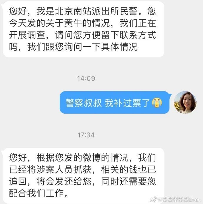 当晚巢怡雯再发微博感慨“没想到我也有被退钱的一天”“北京南站的警方看到我的微博迅速行动,短短几个小时就把黄牛抓起来了!还联系我退了钱!平生第一次!给辛苦作业的警察叔叔点赞!”