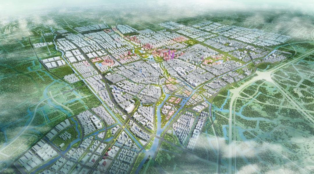 “水”为青浦新城最突出的文化标志,建立生态自然与人行动线交叠的“水陆双棋盘”总体空间肌理。将蓝绿生态空间、交通网络、城市功能叠合,聚焦复兴多处城市特色文化片区,在风貌上充分演绎“高颜值、最江南、创新核”的青浦“江南风”城市意象。