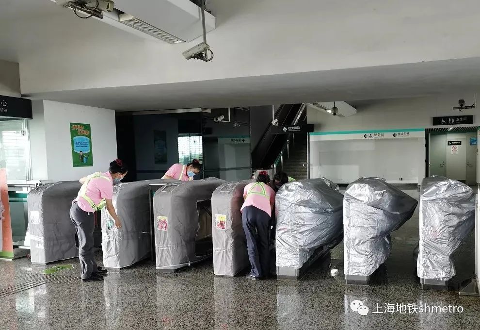为防止雨水渗入闸机、导致设备故障,书院站的工作人员专门为闸机穿上了雨衣,给自动售检票设备套上了防雨罩,就为了确保这些设施设备在恢复运营时能第一时间投入正常运行。