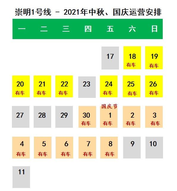 根据2021年中秋节和国庆节放假安排,调整运营时间,以满足大家假日期间的出行需求。