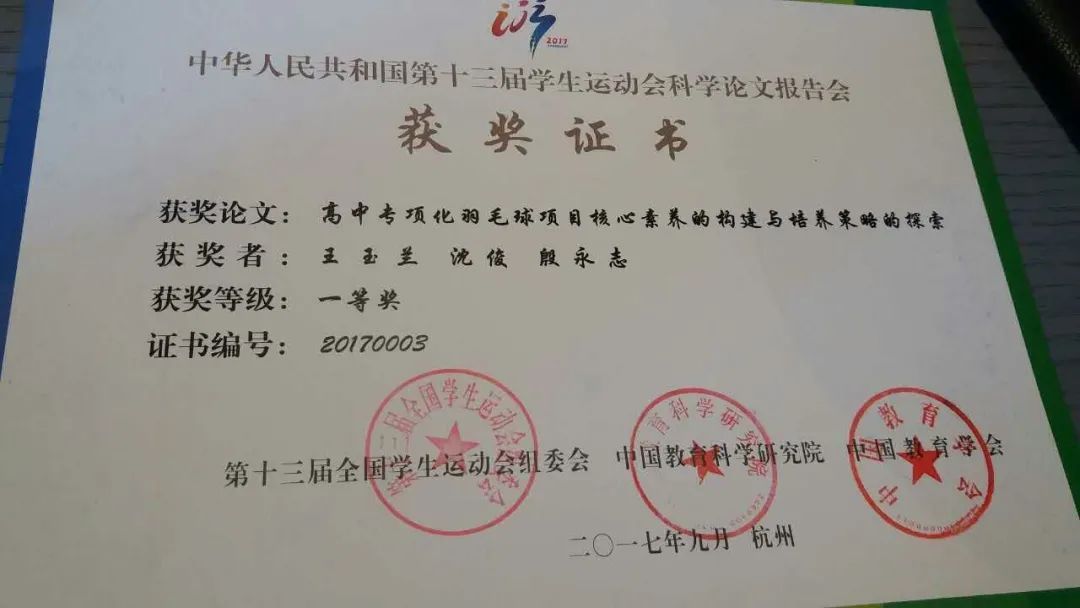 学校在体育育人上的探索始终在继续。2013年10月,新中成为上海市高中体育专项化教学改革羽毛球项目中心组所在校,殷永志老师担任中心组组长;2017年9月,王玉兰、殷永志、沈俊三位老师合作发表的《高中专项化羽毛球项目核心素养的构建与培养策略的探索》论文荣获“全国体育科报会”一等奖;2018年6月,殷永志老师主讲的《羽毛球1:正手发、击高远球》《羽毛球2:正手杀球》《羽毛球3:反手发网前球和正手挑球》网络课程资料被教育部“国培计划(2018)”远程培训项目录用。