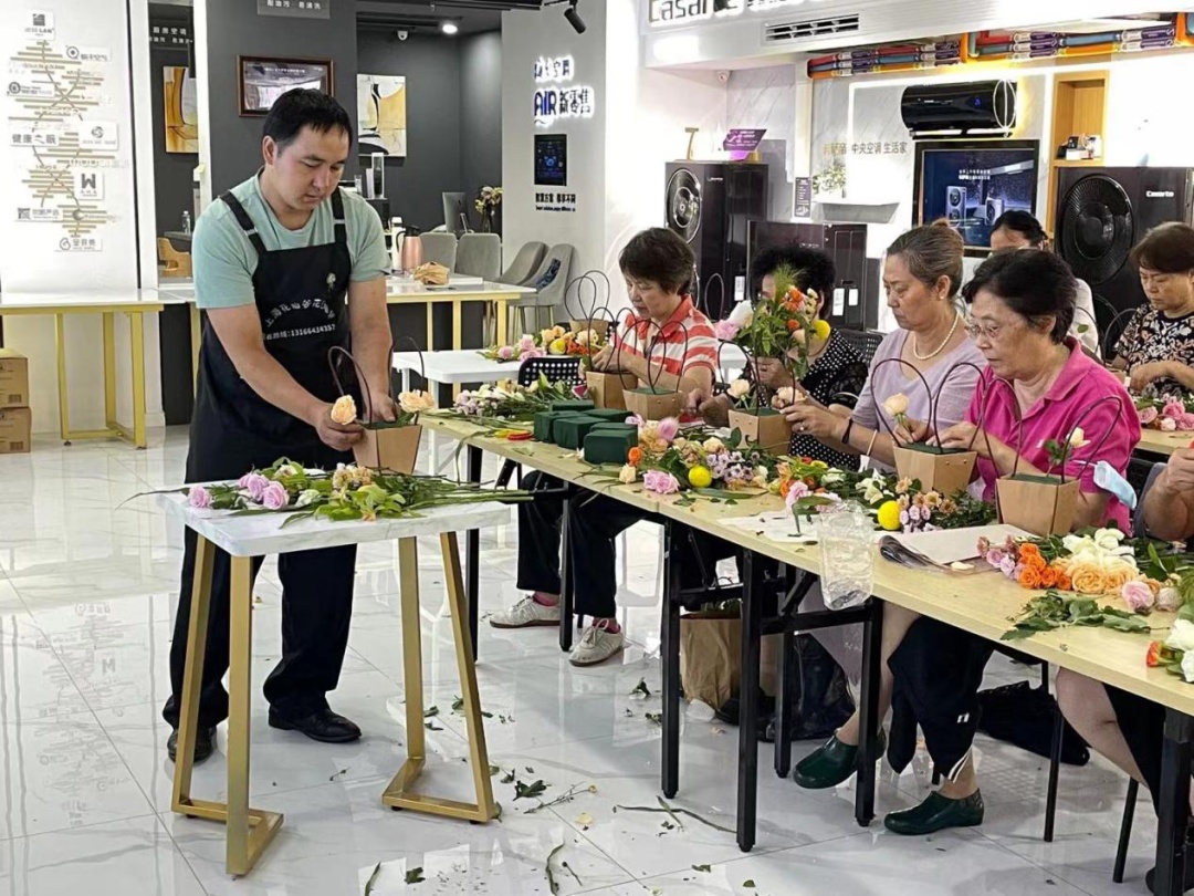 一花一世界,一叶一乾坤。在放松愉悦的氛围里,大家或相互交流,或向老师提问,制作完成后,美丽的花束赏心悦目,社区居民的笑容也像花儿一样。