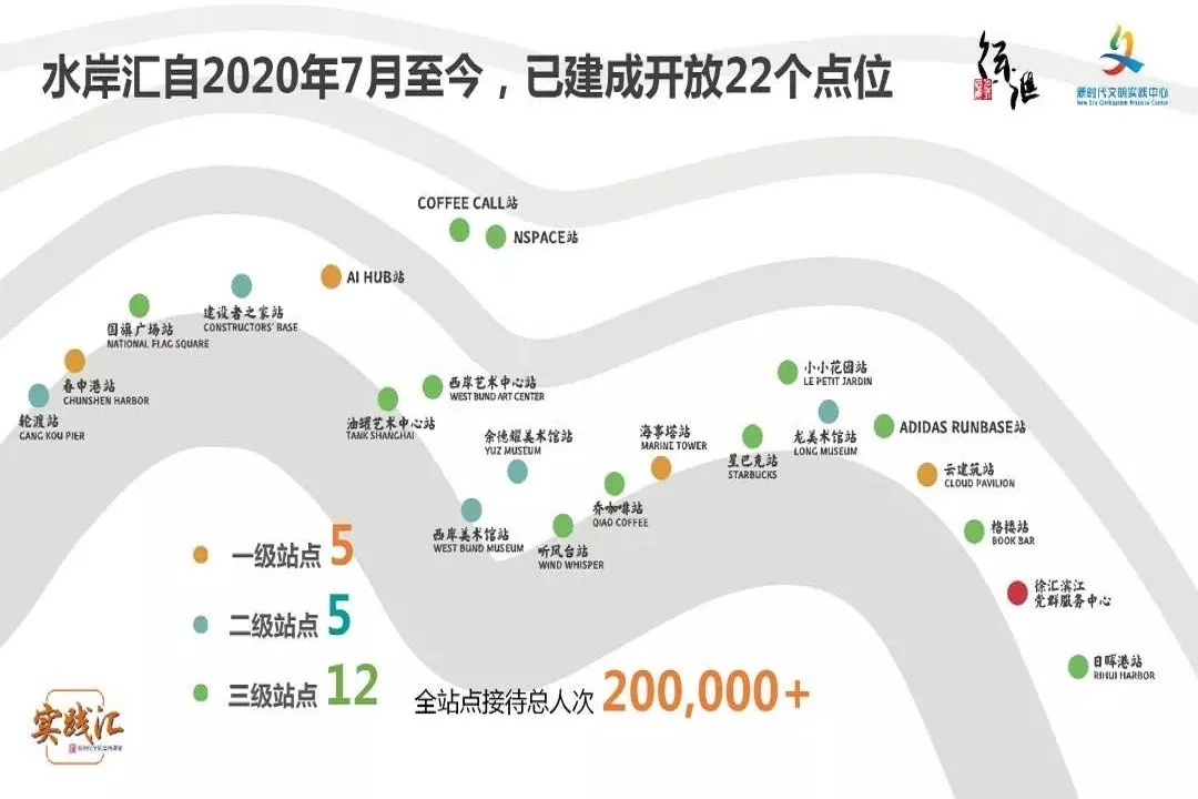 围绕“水岸汇,惠你我,共享卓越西岸新生活”服务理念,结合滨江文明示范带建设,徐汇滨江在8.4公里岸线共设置云建筑站、格楼站等22处水岸汇新时代文明实践点,把最好的滨水资源留给人民。