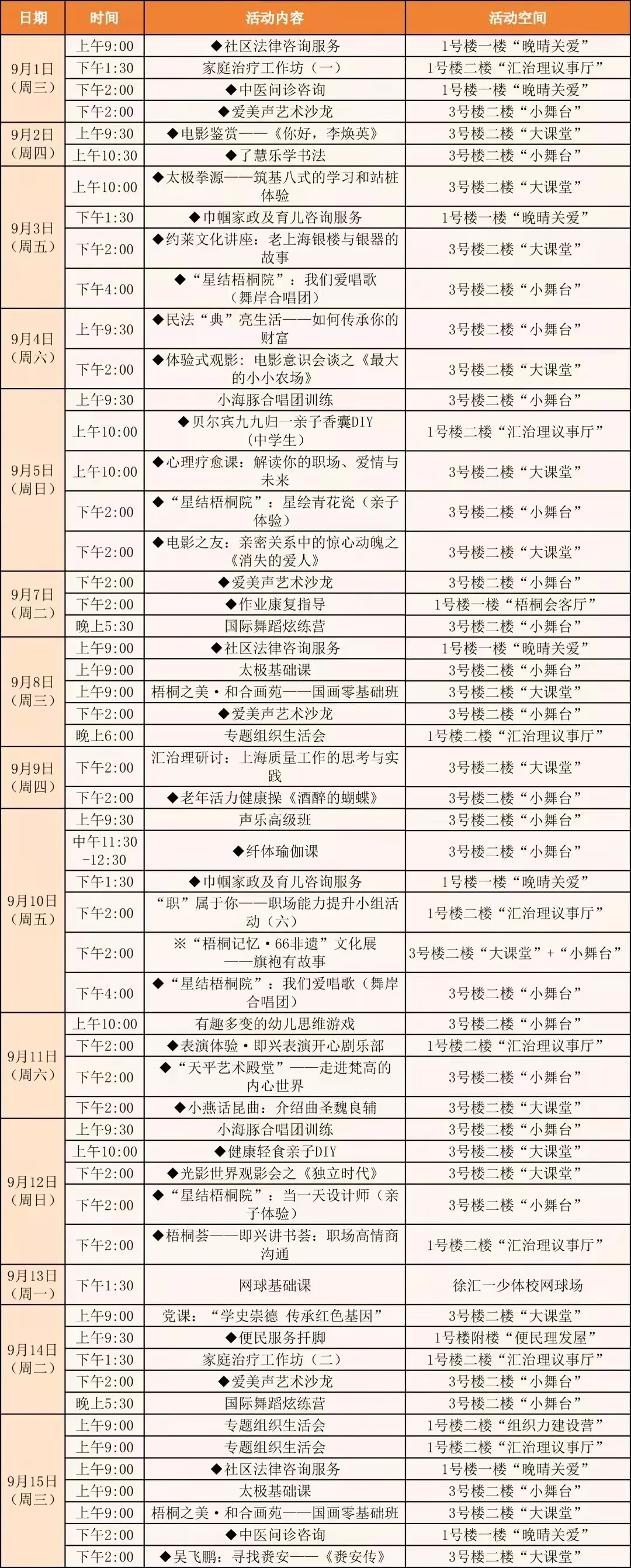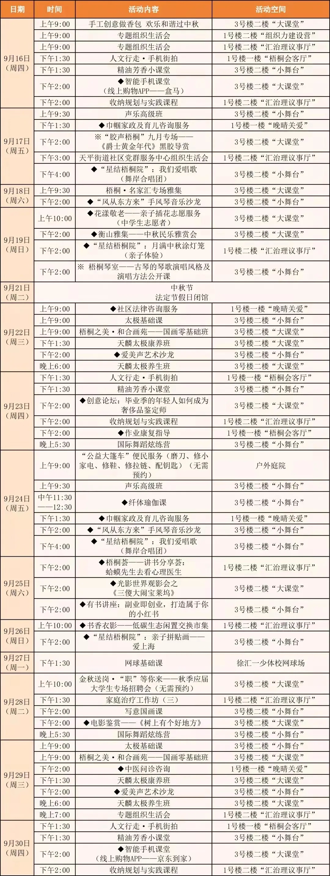 ▲66梧桐院·邻里汇新时代文明实践点9月“生活菜单”(点击可查看大图)