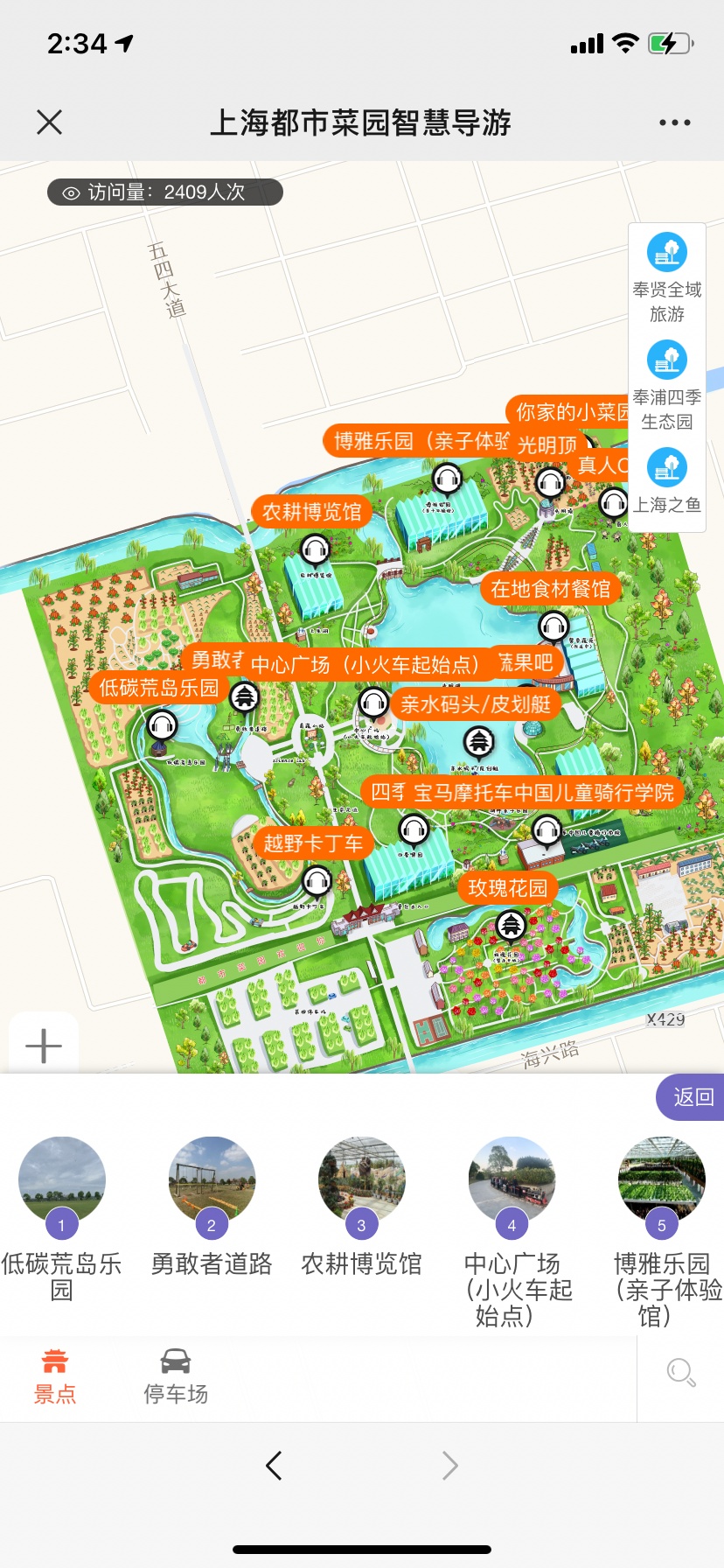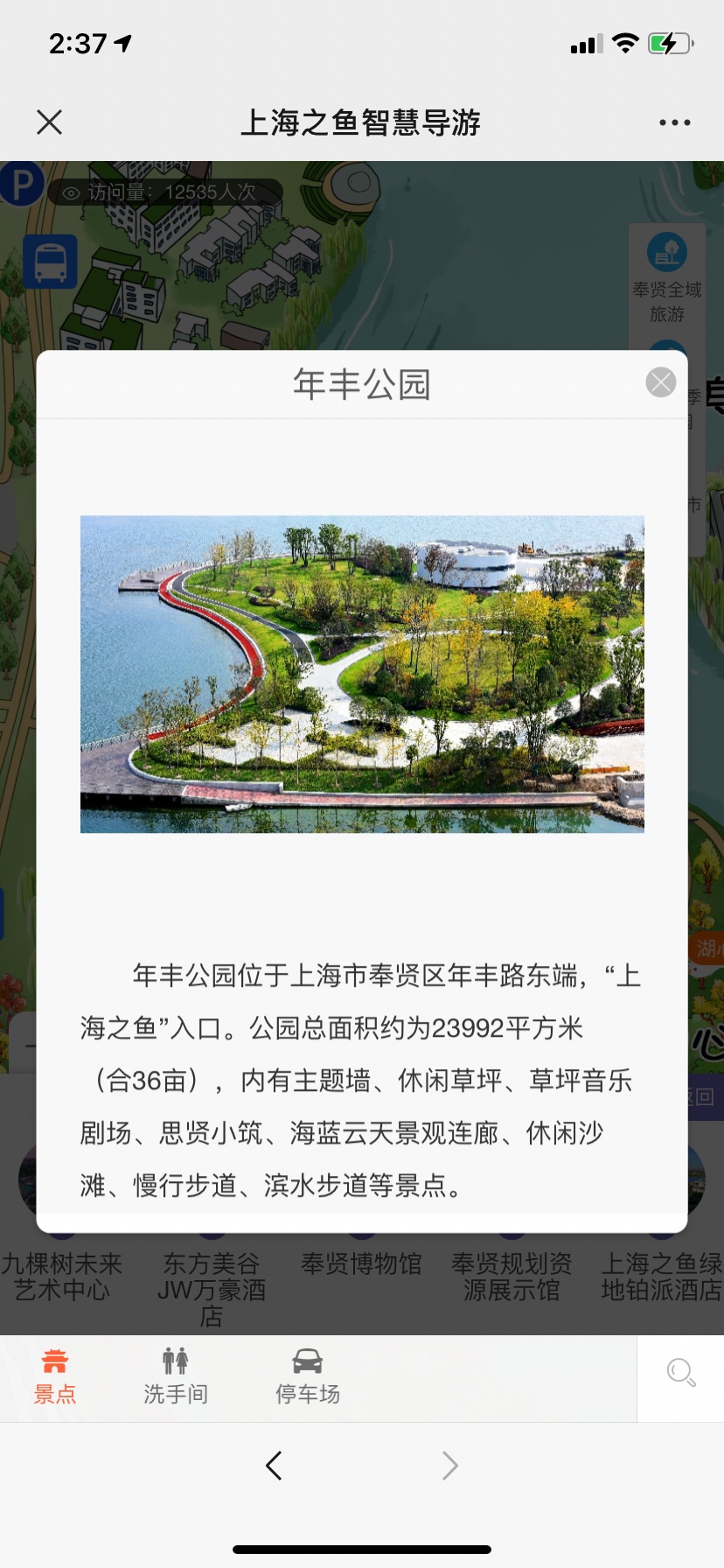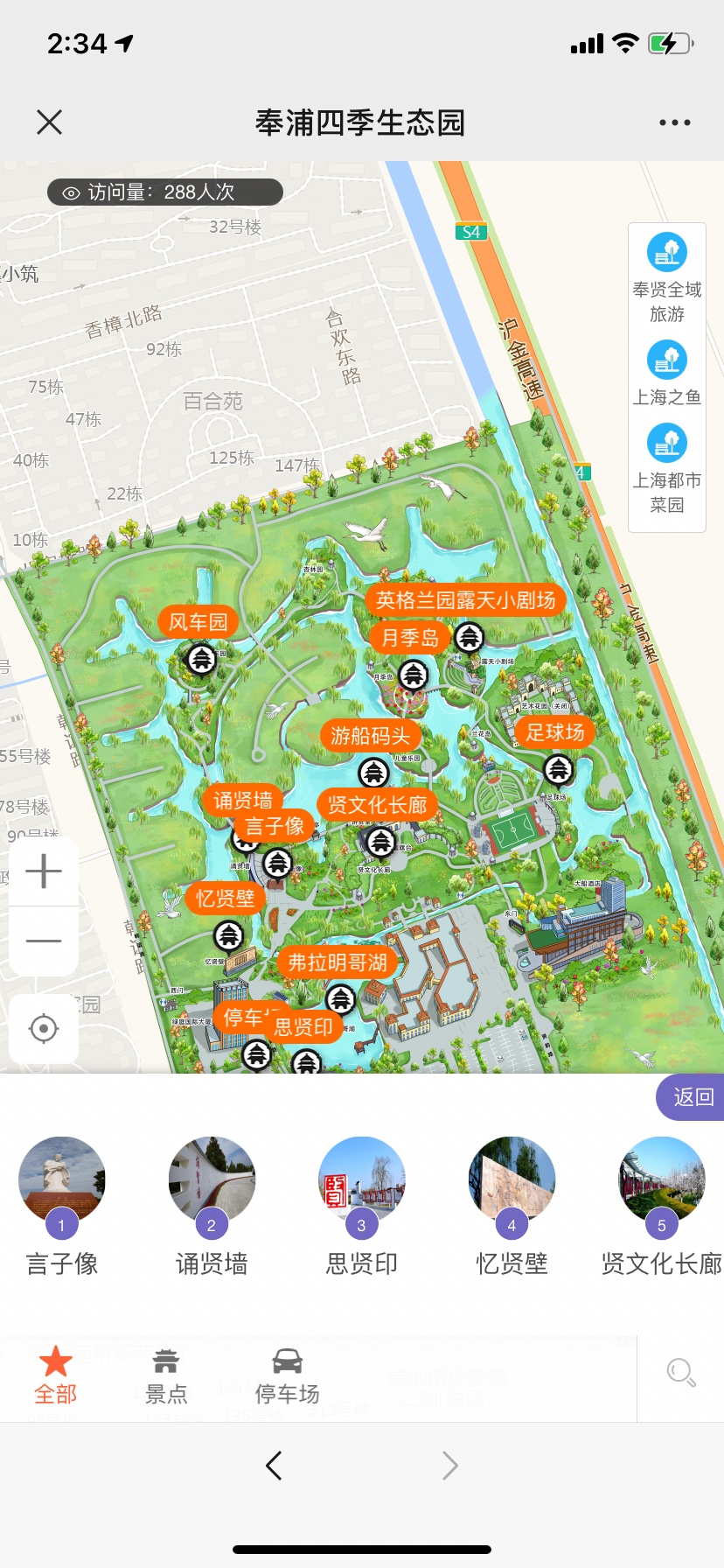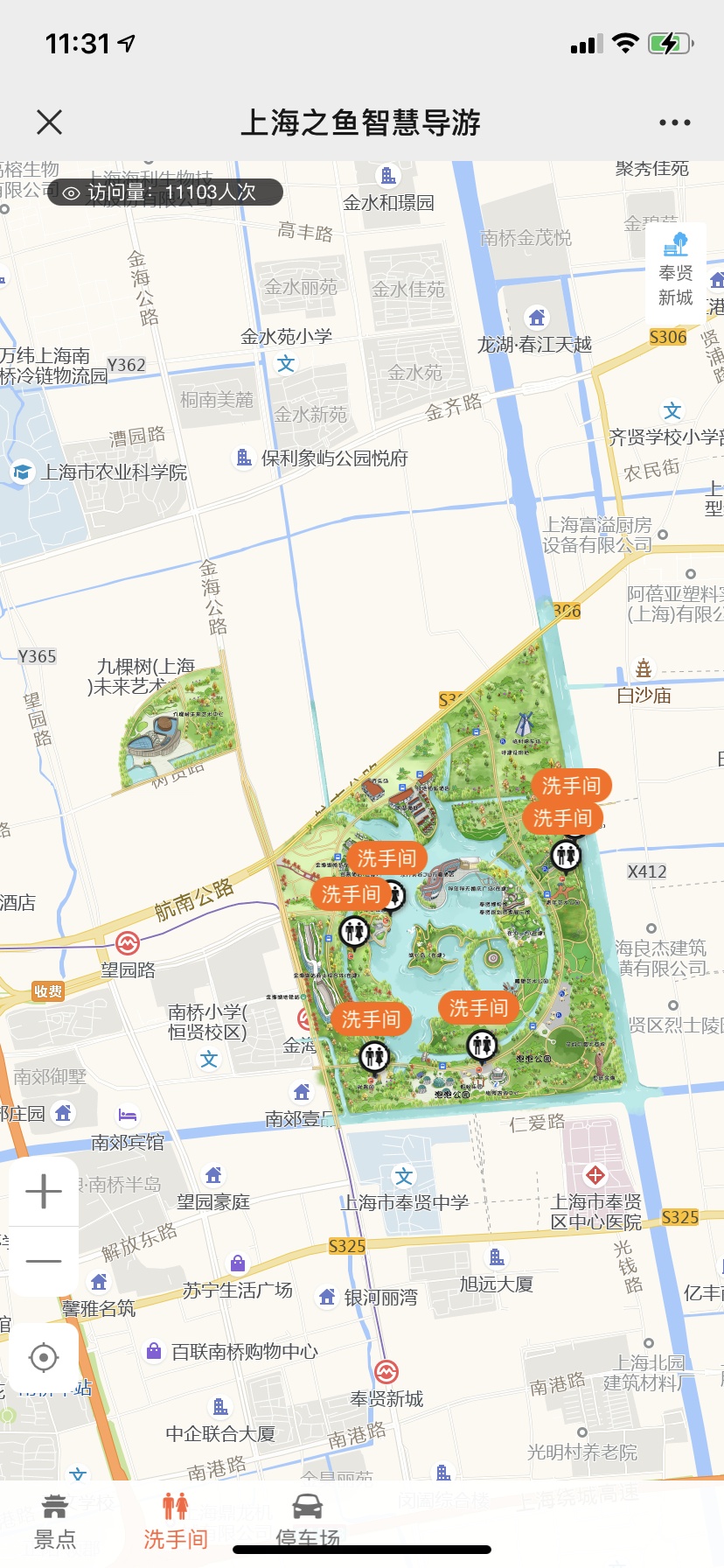 在奉浦四季生态园、上海之鱼、都市菜园等几个大型景点,点击后可看到洗手间和停车场按钮选项,点击后了解景区内全部停车场和卫生间的位置。游客可以在到达景区前提前规划停车路线,景区内游览时也不怕找不到卫生间,超人性化的体验,让游客随时随地享受便捷服务。
