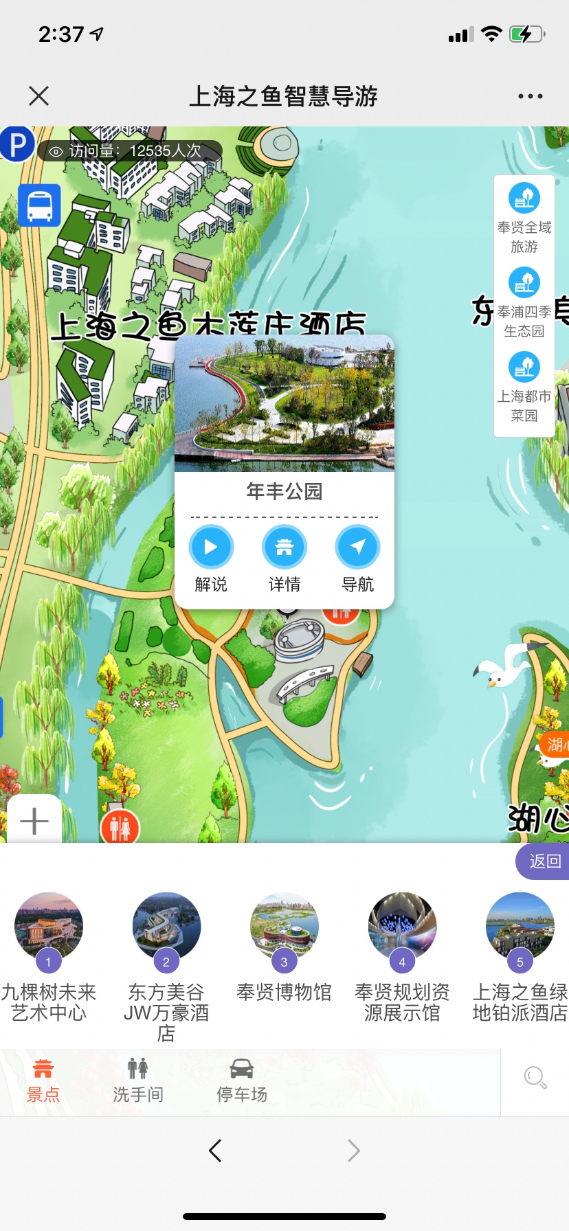 和传统地图相比,奉贤文旅地图将景区内的重要景点信息全部呈现在导览界面上,游客可以轻松获取,极大程度方便了游客的出行规划及景区内游览,页面下方还可滑动查看景区内所有景点,确保不会漏掉任何一个打卡点,让游玩之旅更便捷,更尽兴。