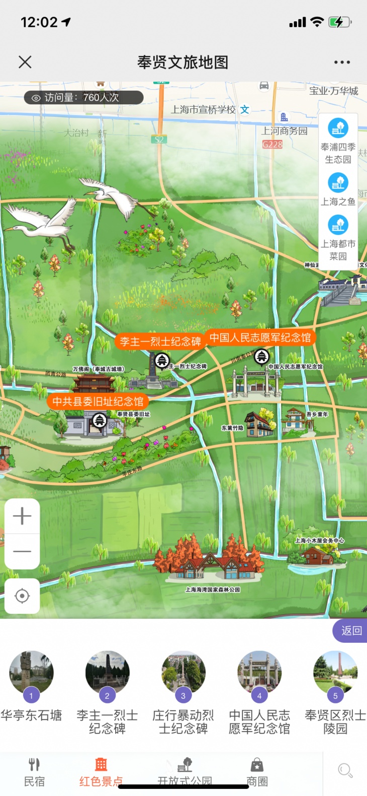 针对传统平面地图无法呈现景区人文风景、历史文化、服务设施等缺点,奉贤文旅地图以手绘的形式,结合GPS导航系统,构建出一个图、文、声、形并茂的智慧景区服务系统,为奉贤游客打造全新的旅游体验。