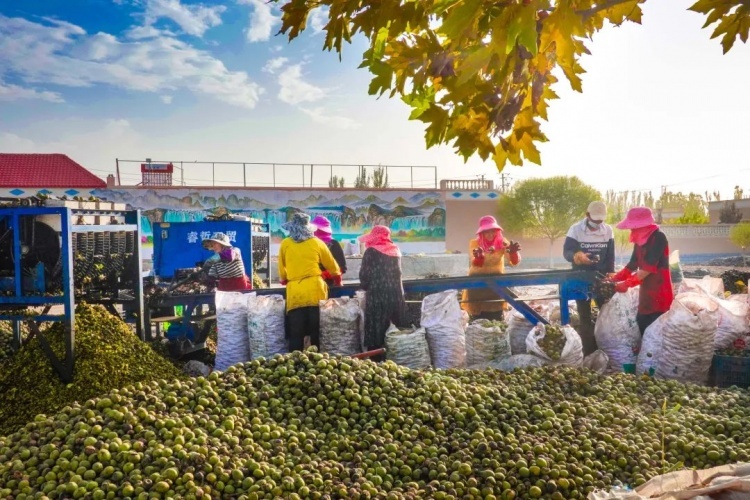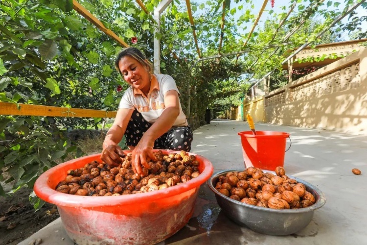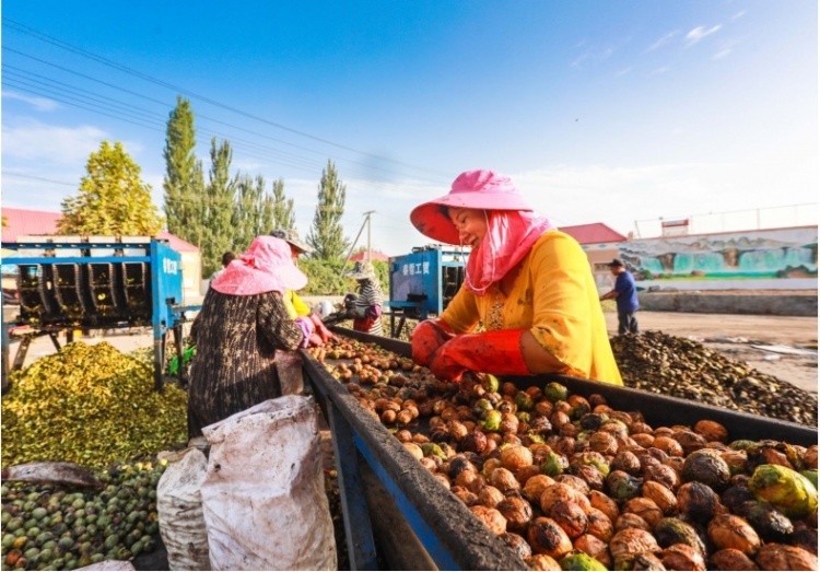 阿热勒乡的核桃收购点,村民们正在筛选经过机器剥离的当季核桃。