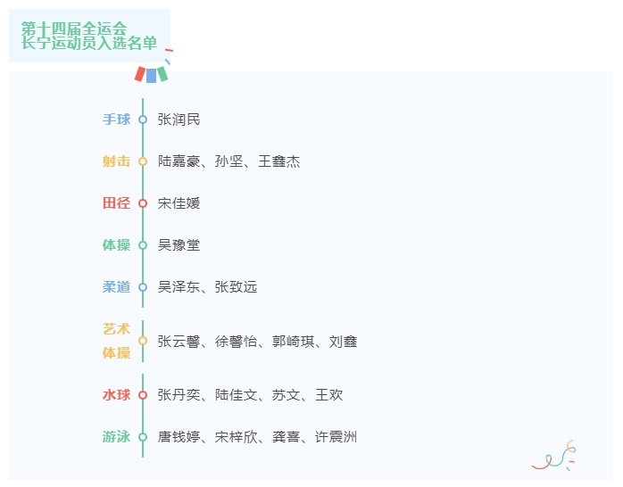 根据第十四届全运会官网公布的参赛运动员名单统计,竞技体育项目方面,长宁共有20名运动员参加包括手球、射击等8个项目的比赛。