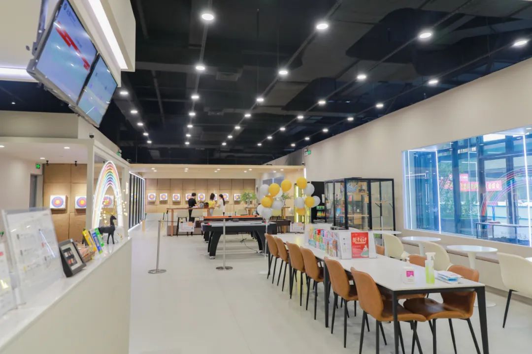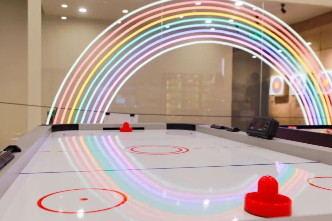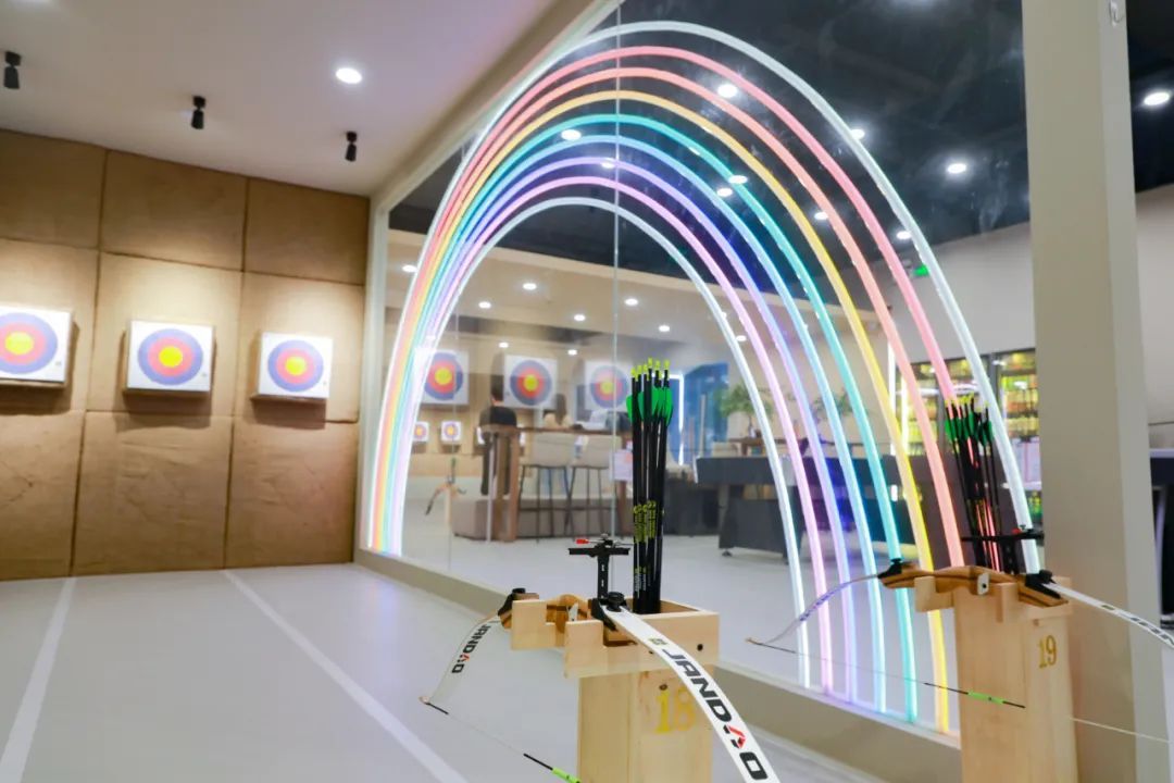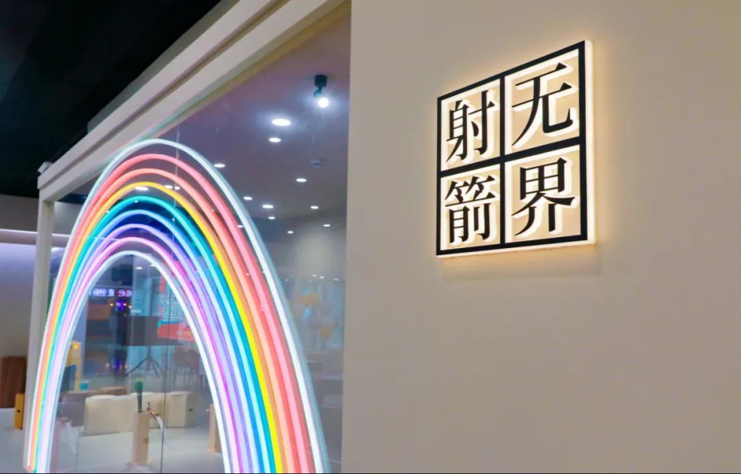 进入门店,一眼便看见儿童区,箭道大约是5米的距离。这里被设置成透明区域,最吸引人的便是彩虹霓虹灯,也是打卡拍照的最佳选择。