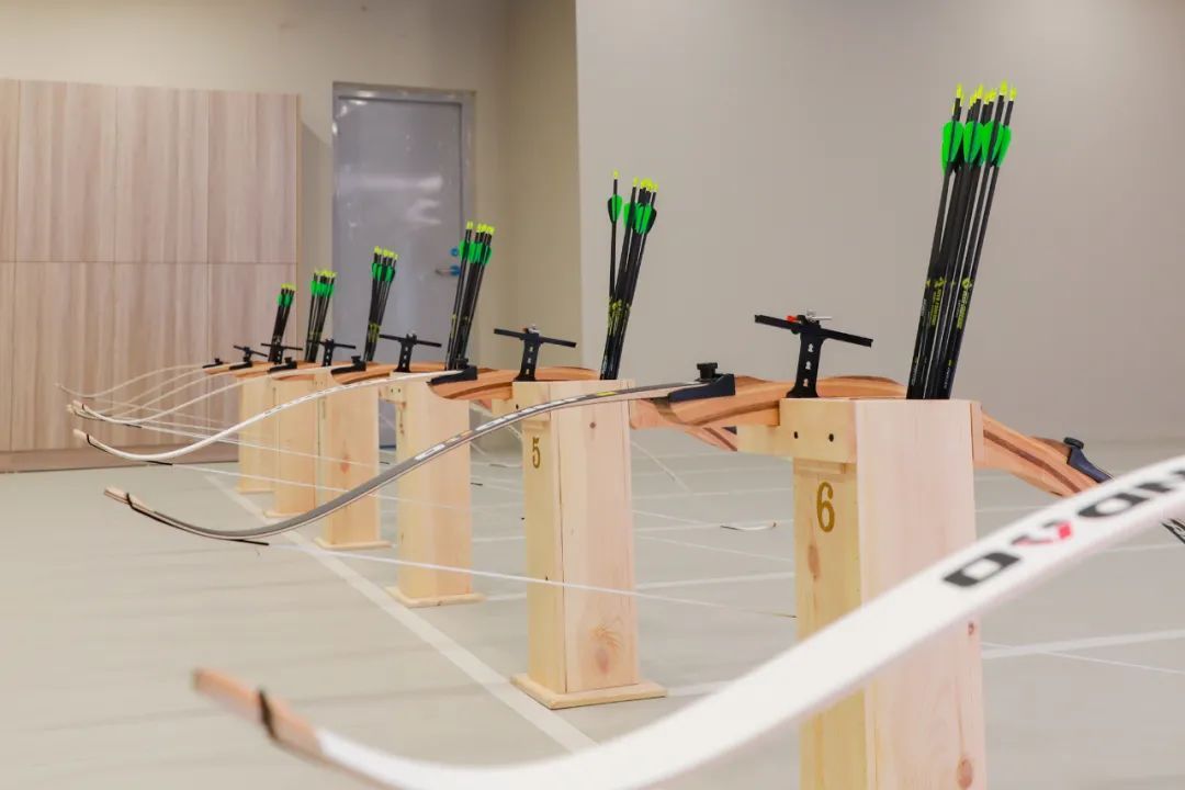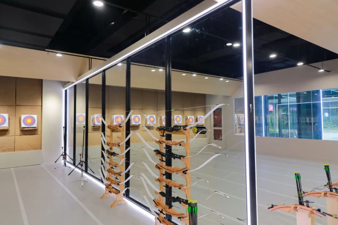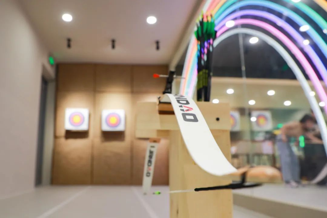往里走便是新手区,箭道约在10米左右,设置了多个箭道,也是场馆中面积最大的区域。看似距离不远,好像轻松就能射中靶心,但真正拿起弓,才发现颇具重量。松手的瞬间,感受到弓弦的力道。对新手而言,想射中靶心可真不容易。