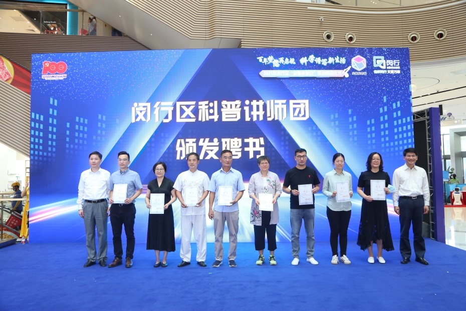 闵行区政协副主席王一力,闵行区颛桥镇党委书记傅爱明为闵行区科普讲师团颁发聘书,旨在激励全区更多科技工作者践行科技志愿服务精神。