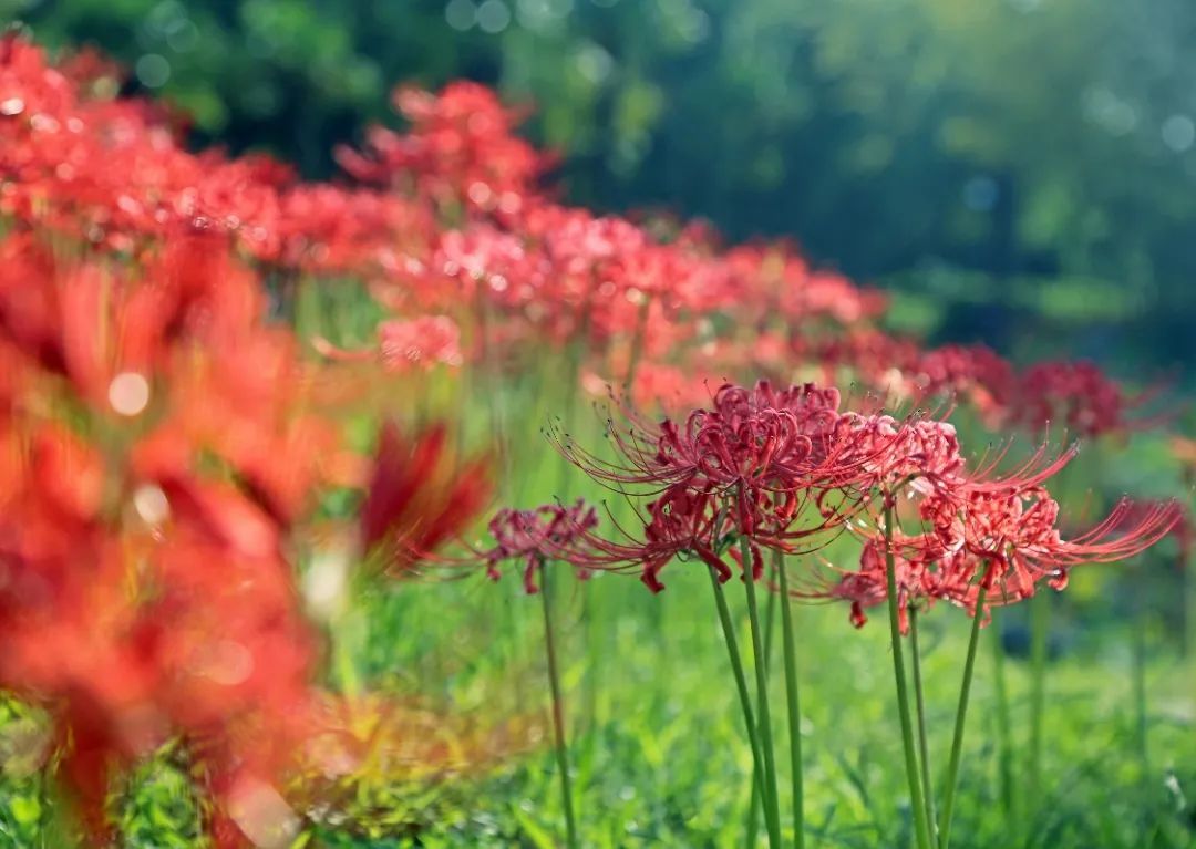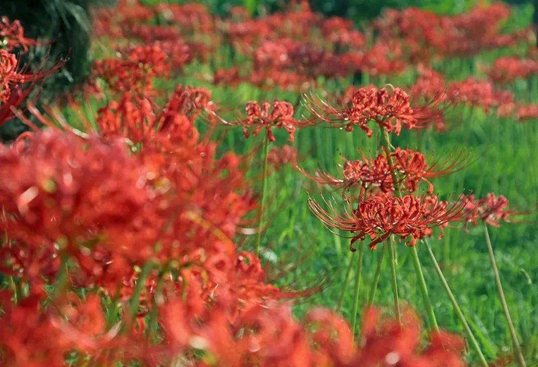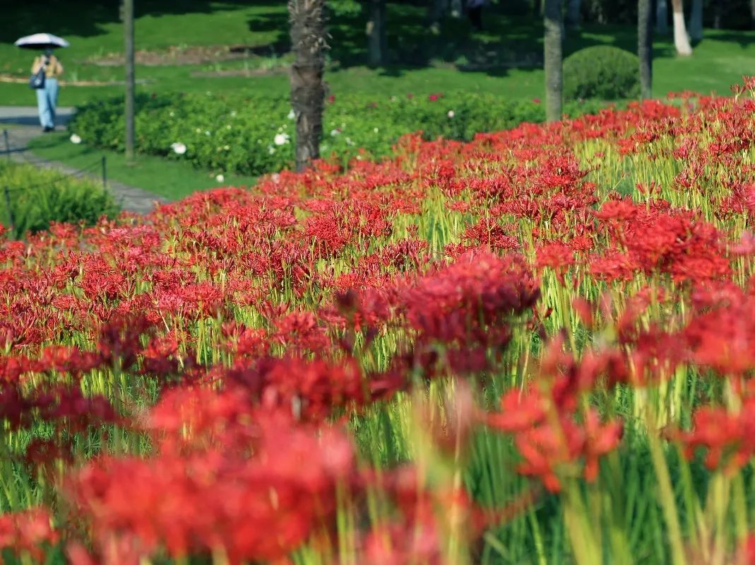 整个中秋佳节,小编最推荐观赏的便是石蒜了,在过去的五年中,依托科研和园艺团队的力量,在园内栽植了十余个种(品种),约3600平方米的石蒜属植物,打造了石蒜属景观特色植物区,强烈推荐的便是环保区草坪附近,该处是园内规模最大、面积最广的石蒜观赏区,漫坡的红色望不到尽头,颇为壮观,步入其中置身红色花海,推荐身着与红色易搭颜色的衣服前来哟~