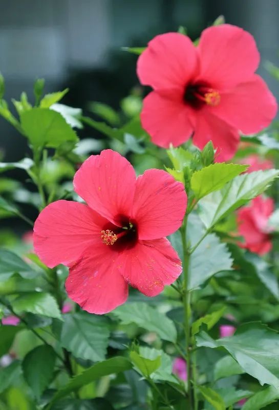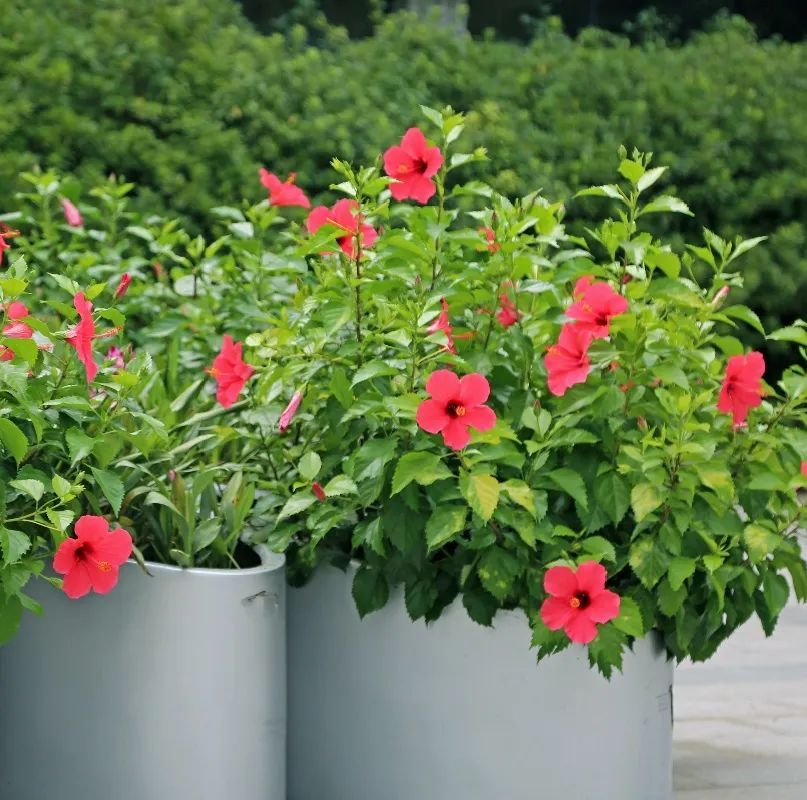 植物大楼门前的立面墙体以彩色三角梅花槽和垂吊大花海棠形成阳台景观,用鲜艳的颜色让游客们在游览过程中感受浓厚的节庆氛围;正门广场以欢度国庆为主题,结合姜荷花、扶桑的花箱展示以及三角梅爱心造型组合,绝对是极佳的拍照打卡点。