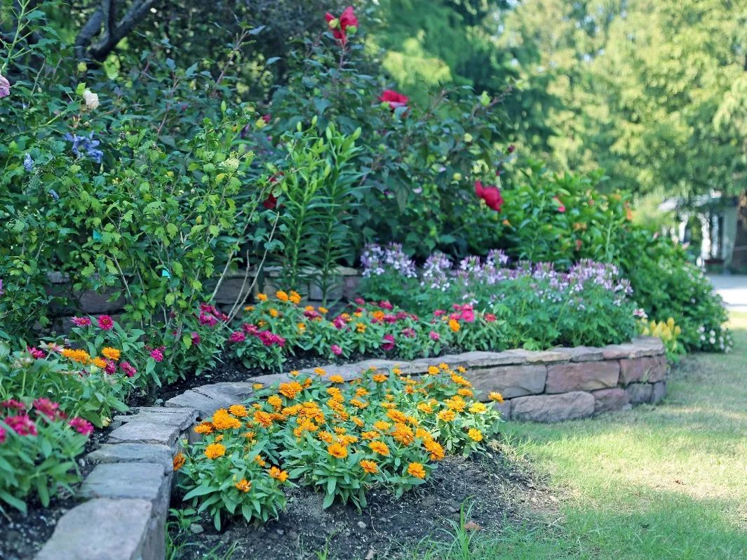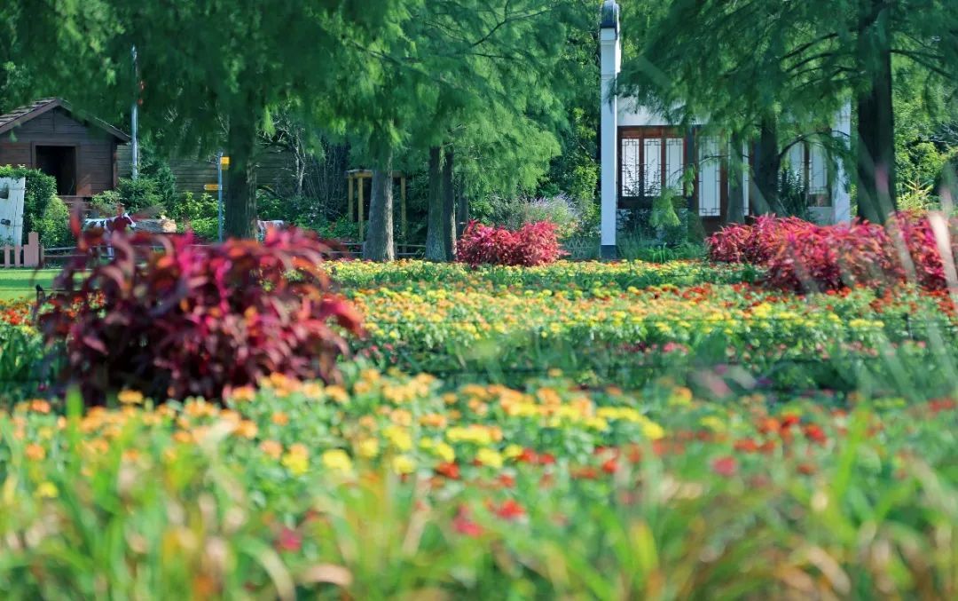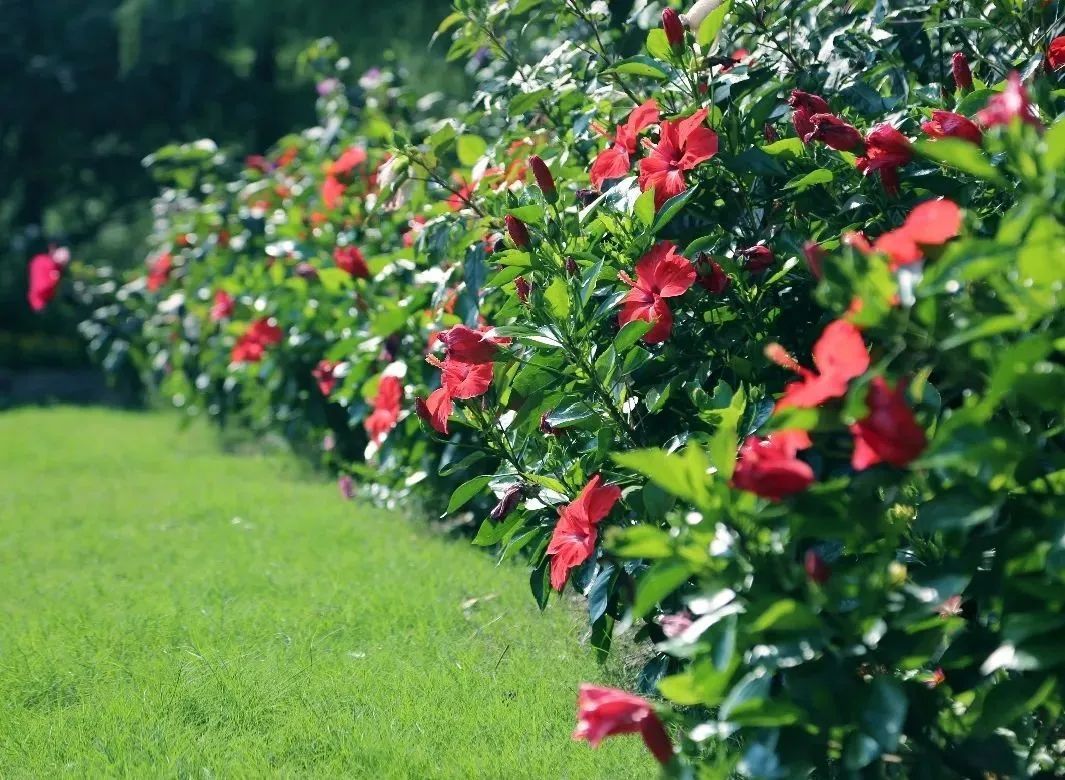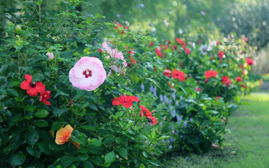 自2号门入园,映入眼帘的就是大片精心布置的花坛花境,大花芙蓉葵、扶桑等夏花鲜艳夺目,与百日草、醉蝶花、长春花以及小兔子狼尾草、蒲苇等秋季花草,共同描绘出一幅秋日佳景。