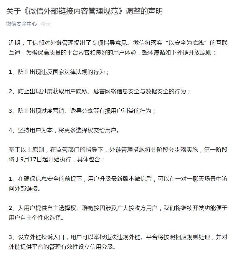 16日,微信安全中心发布关于《微信外部链接内容管理规范》调整的声明,说明微信平台的外链开放原则。其中提到,外链管理措施将分阶段分步骤实施,第一阶段于9月17日起开始执行,具体包含: