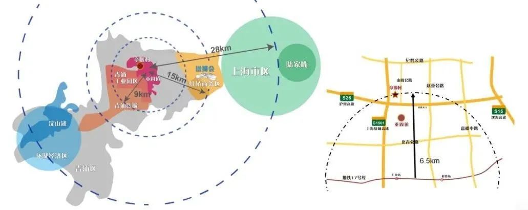 章堰村所在的青浦区是从长三角到上海的必经之地,章堰村距离虹桥商务区15公里。