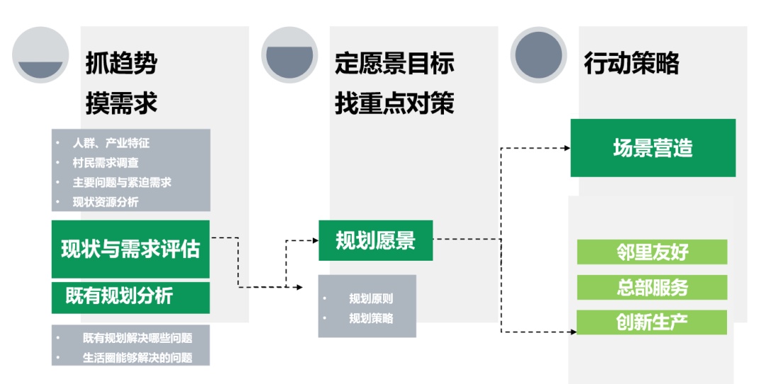以此为依据,对章堰村的发展趋势、需求特征进行深入分析研究,结合既有规划和生活圈规划找到解决问题的重点对策,制定愿景目标。最终确定了章堰村邻里友好、总部服务、创新生产三大乡村社区生活圈场景的定位,并明确了一张蓝图和近远期行动计划。7月,《青浦区章堰村乡村社区生活圈试点行动》基本编制完成,为章堰村的发展提供了清晰的路径。