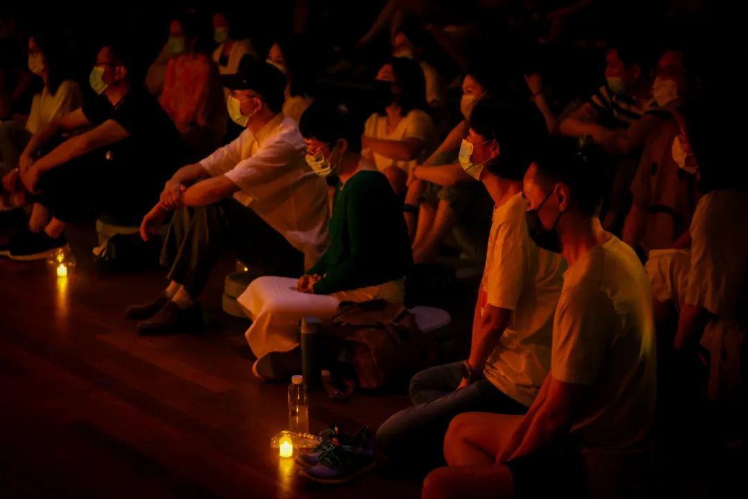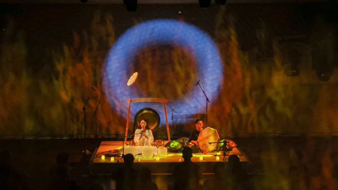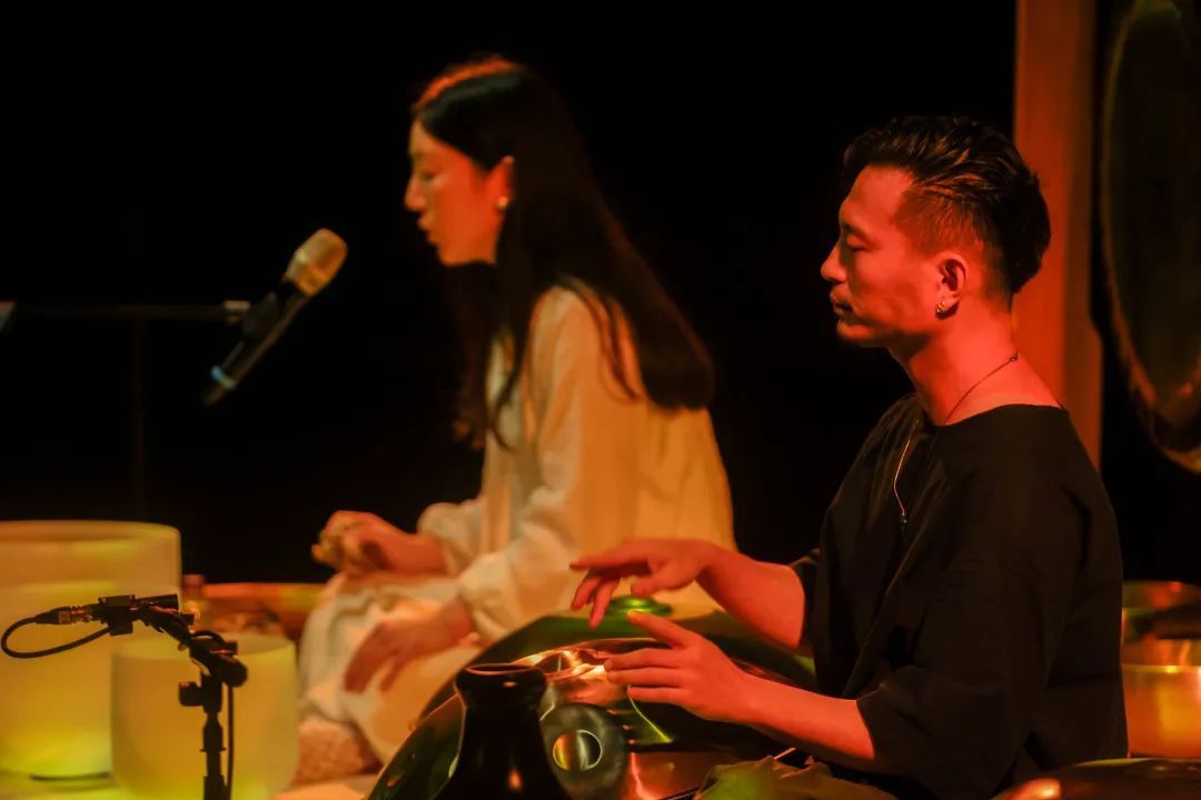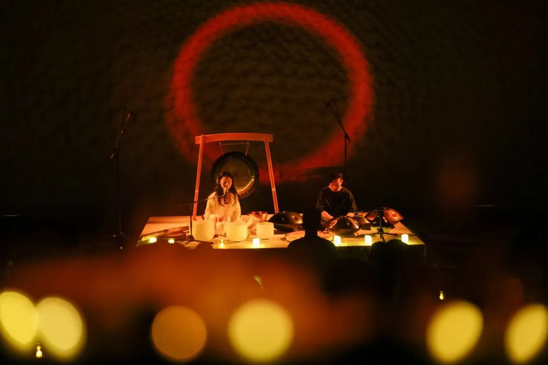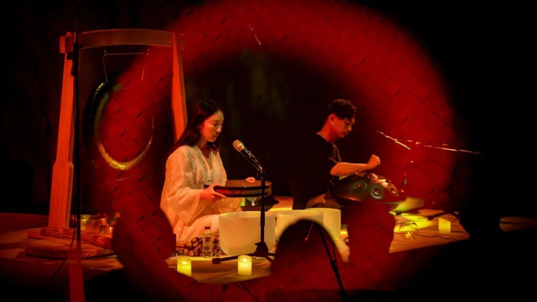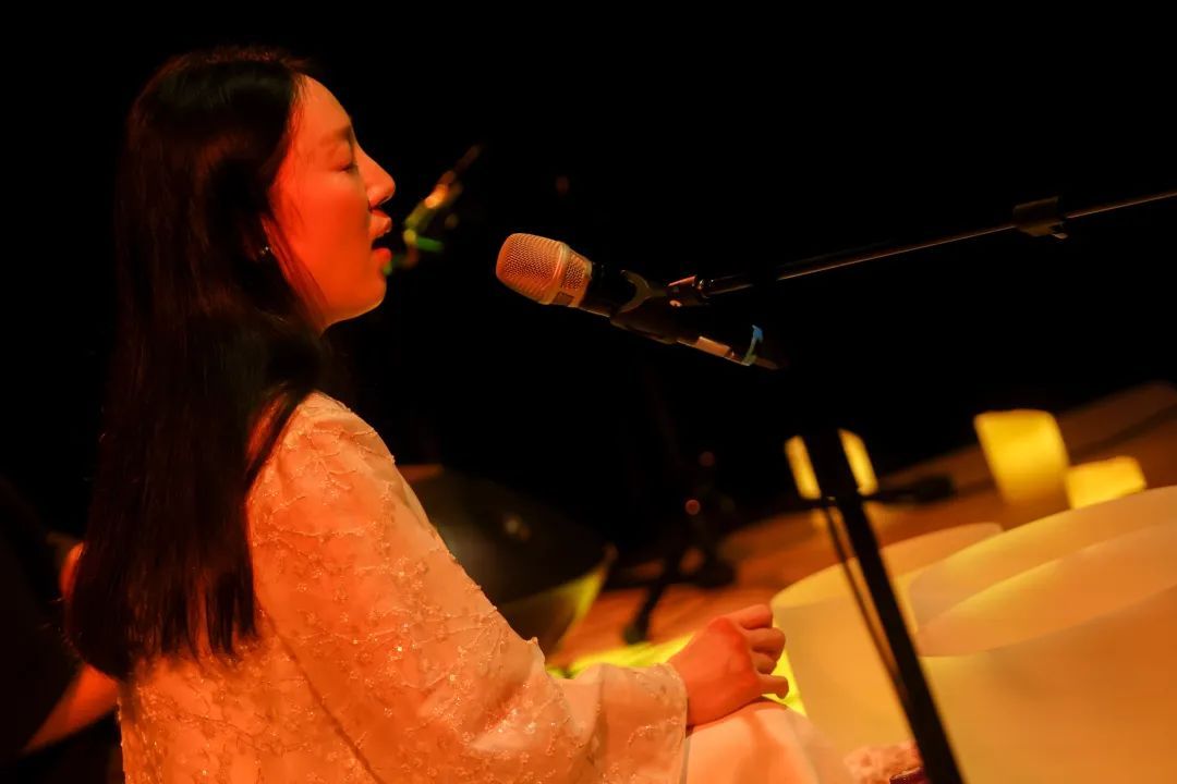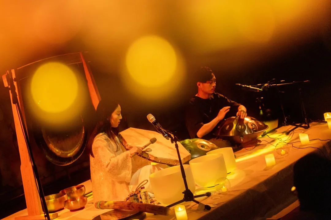 “接下来你的耳边会出现不同的旋律,静静地感受它。”观众们闭上眼睛,跟随水晶钵的敲击和唱诵,内心逐渐回归平静。