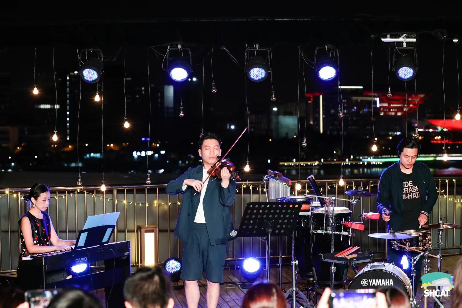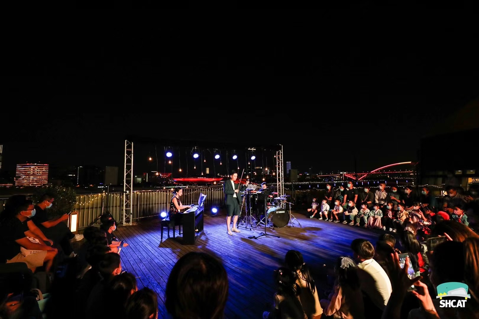 凉凉的秋风拂过脸庞,远处偶尔传来轮渡的汽笛声,对面是世博中心和梅赛德斯的灯光,观众围坐在演奏家的身边,小提琴、钢琴与打击乐器奏出风格不同的音乐,音乐声盘桓飘远。这一幕出现在上海儿童艺术剧场(上汽荣威儿童文化中心)的“露台星空间”系列《听,月亮在唱歌》音乐会上。