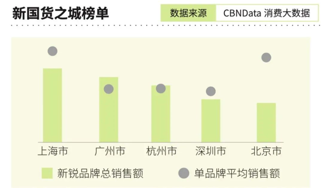 第一财经商业数据中心发布“新国货城市”排行榜,榜单显示,2020年新国货的互联网销售,排名前五的城市分别是上海、广州、杭州、深圳和北京,其中上海的新国货销售占全国总规模的六分之一。这意味着,在这次新时尚引爆的国货消费潮流中,上海再度扮演了流行引领者的角色。